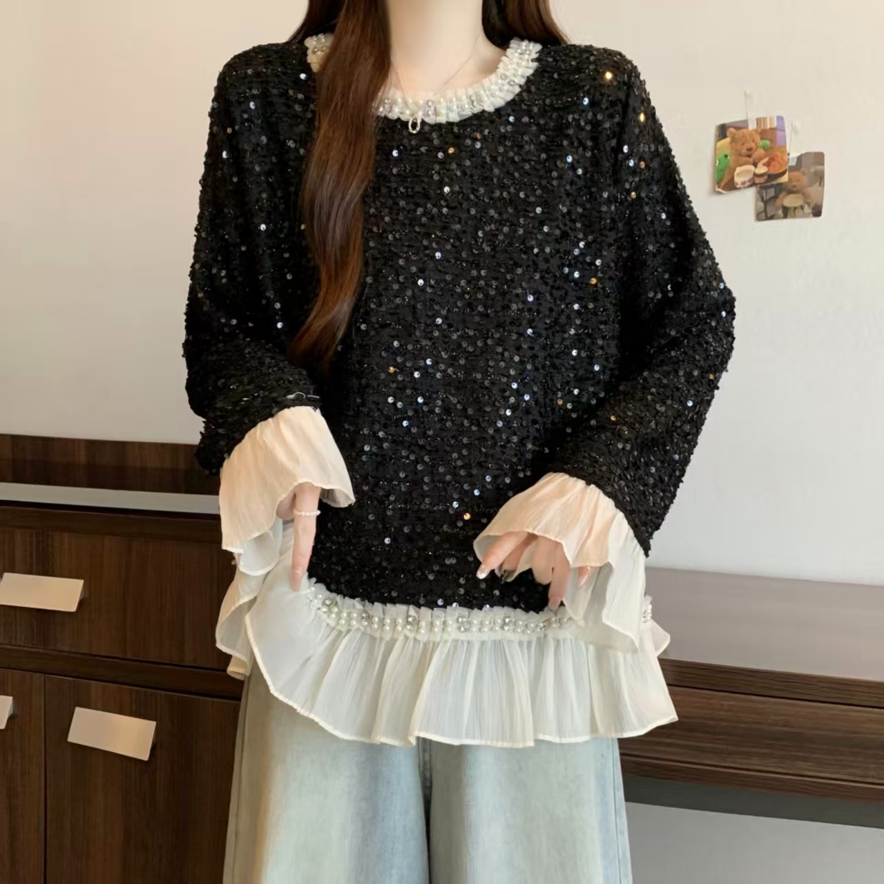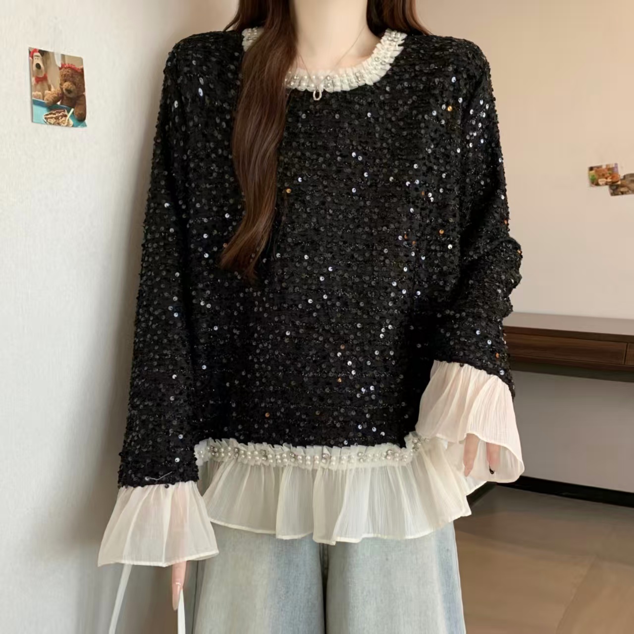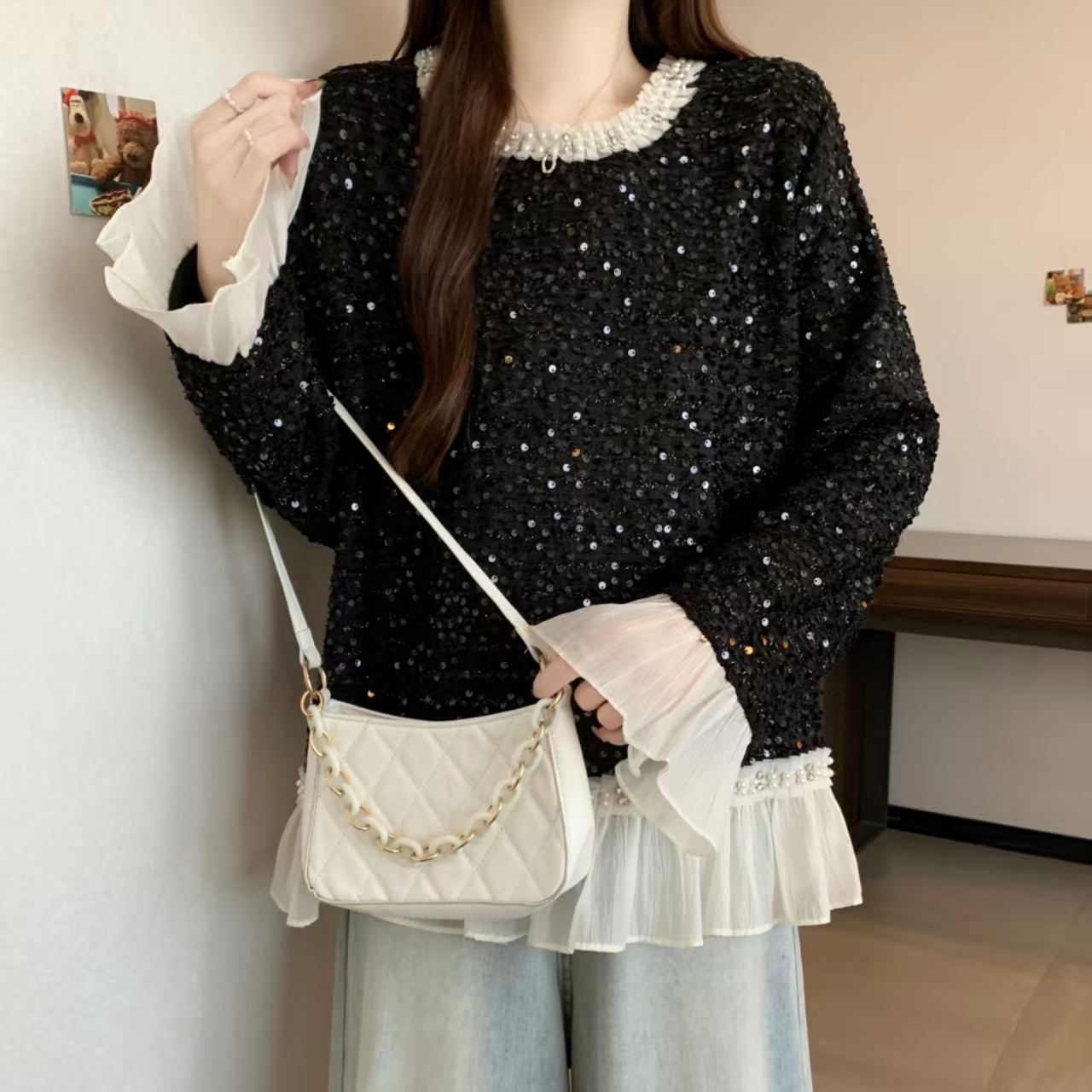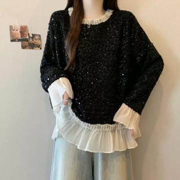 FA52992# ~新款时尚拼接花边小香风长袖T恤洋气重工钉珠圆领打底衫 服裝批發女裝批發服飾貨源