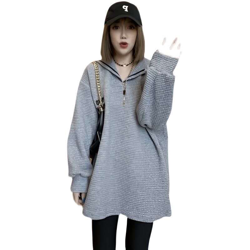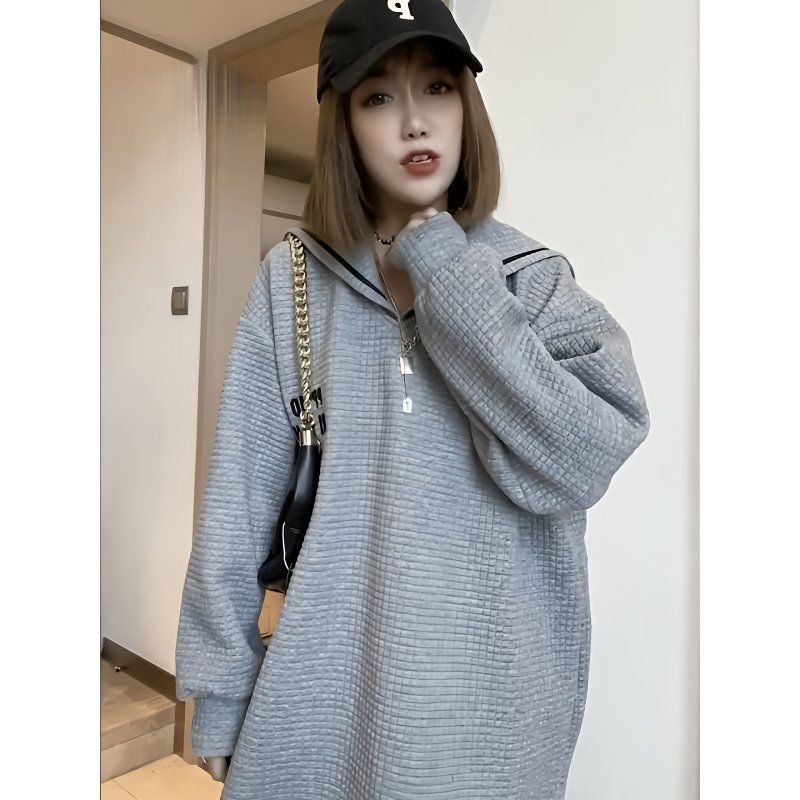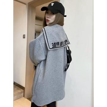FA53099# 特大码300斤欧洲站中长款海军领卫衣秋冬宽松潮流时尚绣花外套女 服裝批發女裝批發服飾貨源