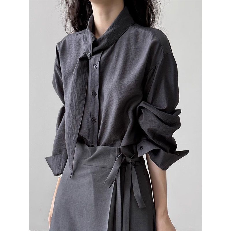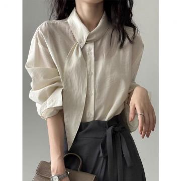 FA53108# 韩系围巾领长袖衬衫女秋季设计小众长袖上衣宽松通勤法式小资小衫 服裝批發女裝批發服飾貨源