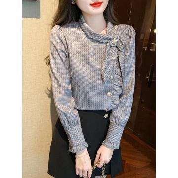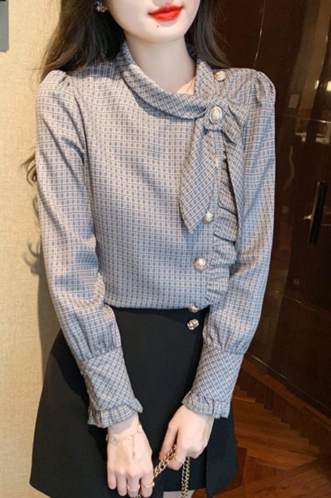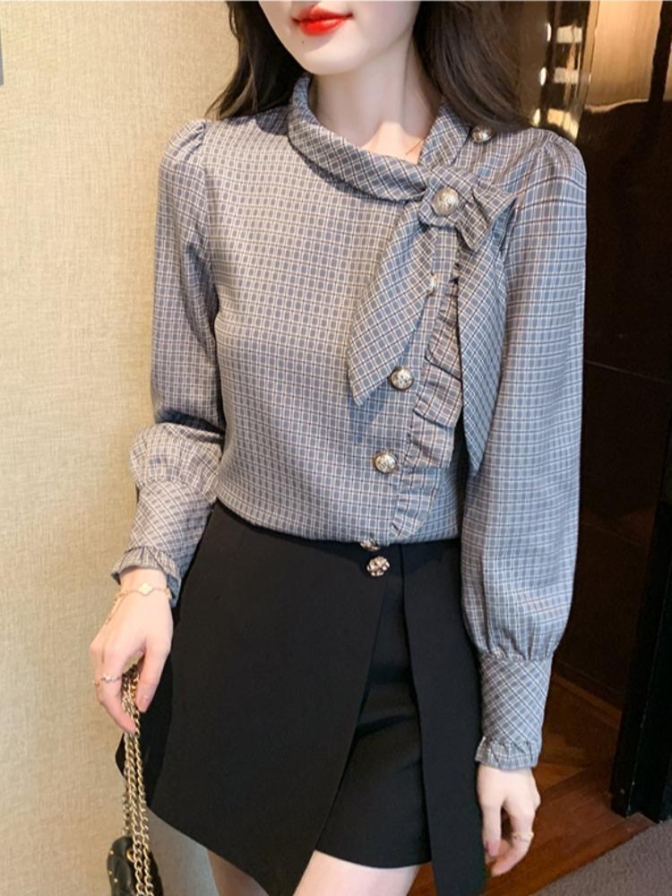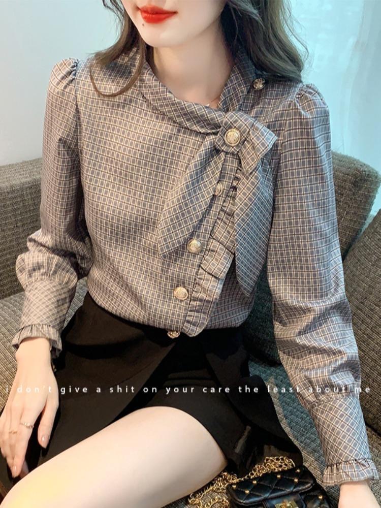 FA53117# 法式高级感雪纺衬衫女轻奢长袖格子上衣新款秋季洋气别致小衫 服裝批發女裝批發服飾貨源