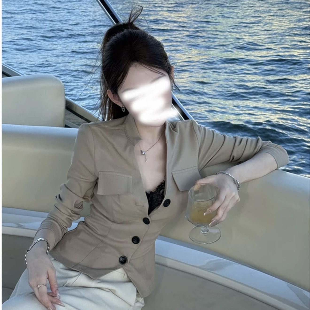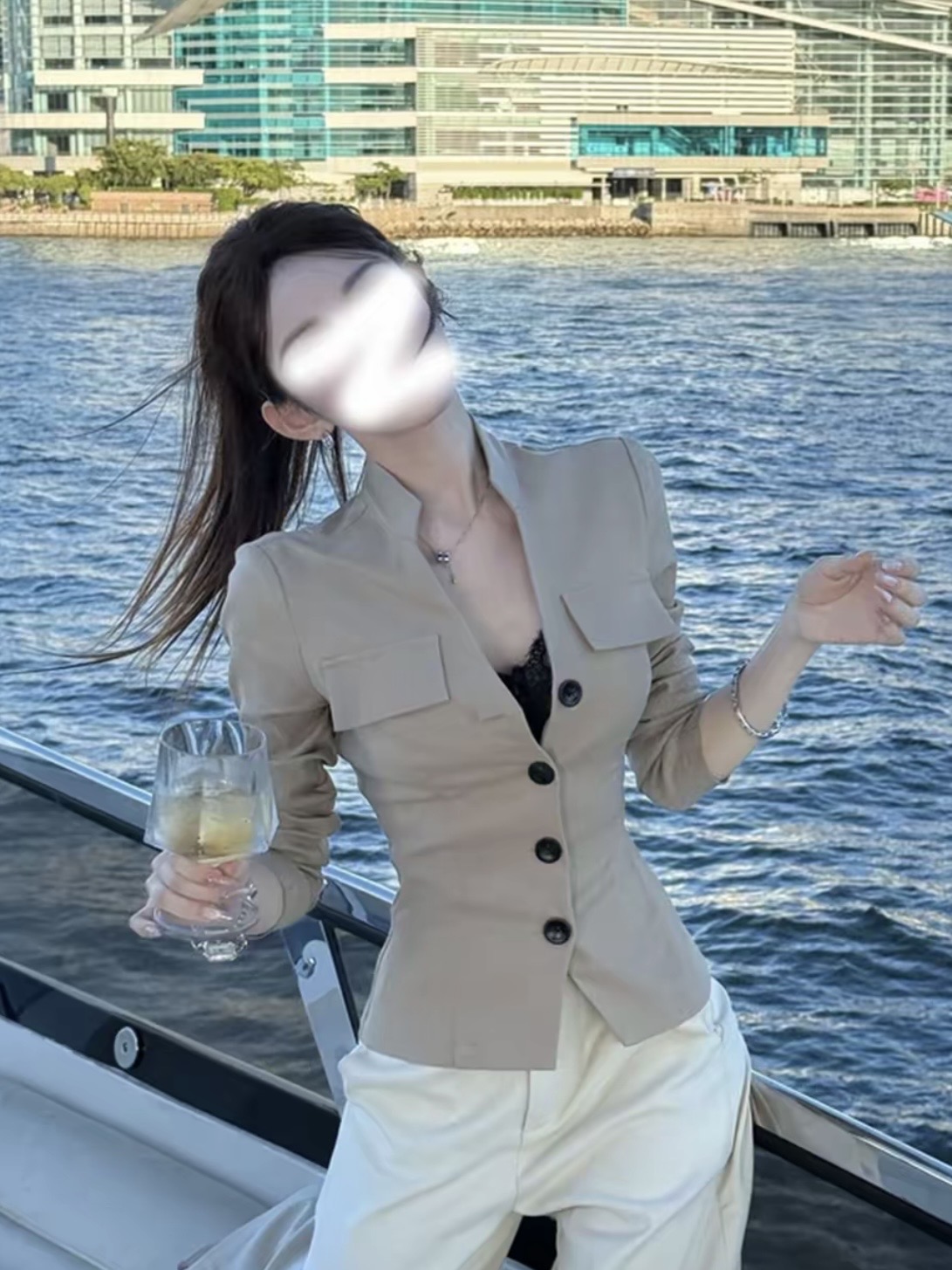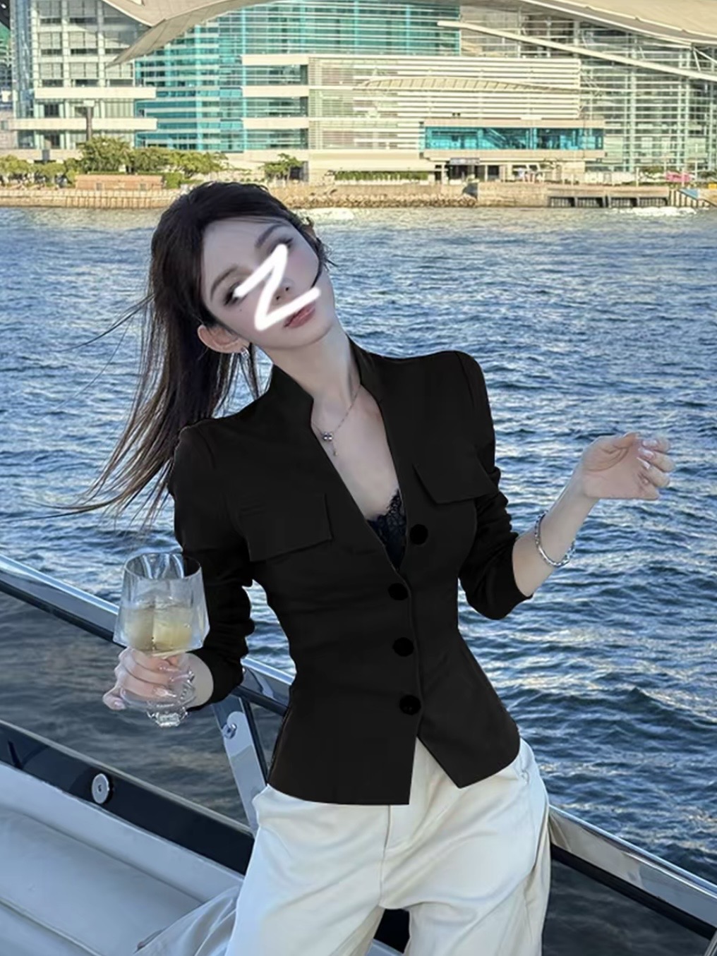 FA53136# 大码时尚早秋双口袋撞色纽扣上衣外套韩系老钱气质掐腰衬衫 服裝批發女裝批發服飾貨源