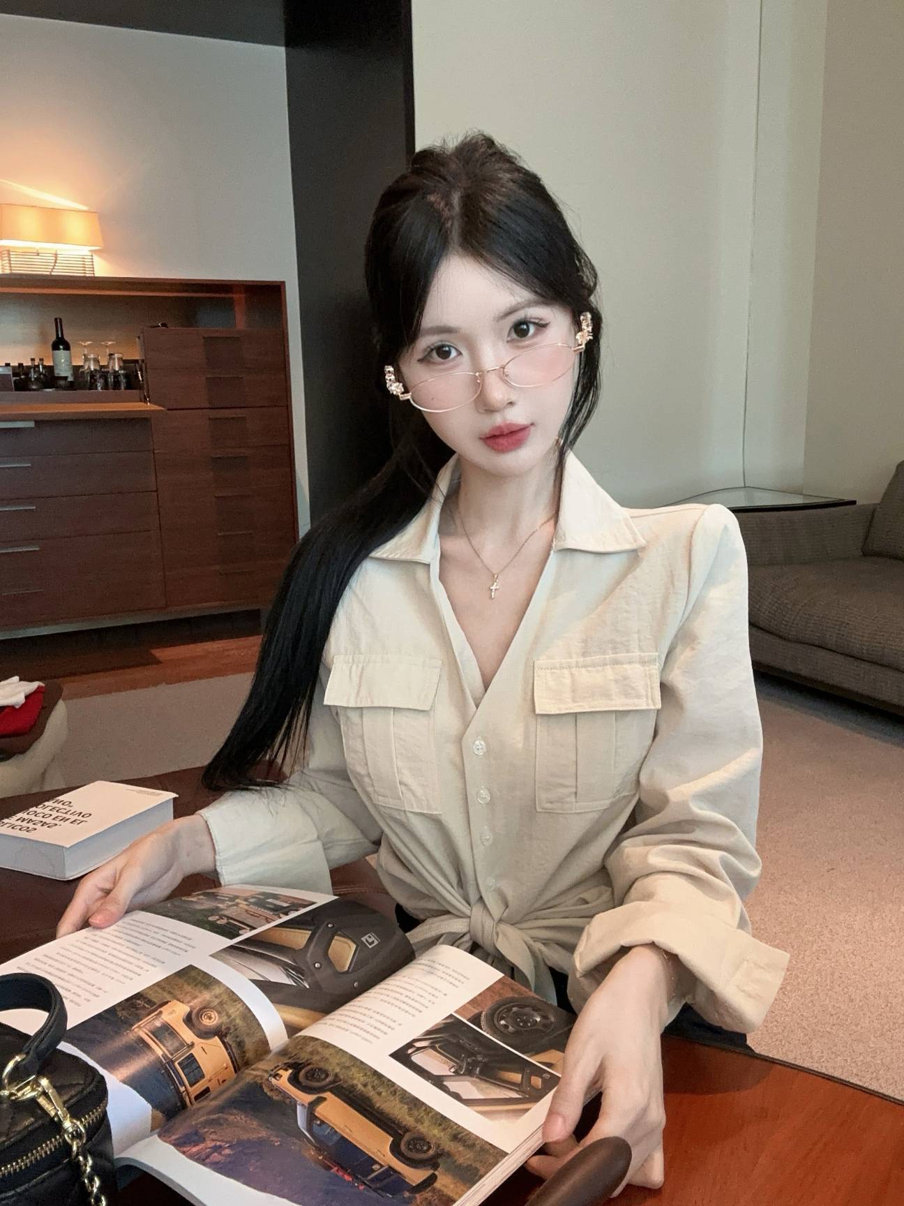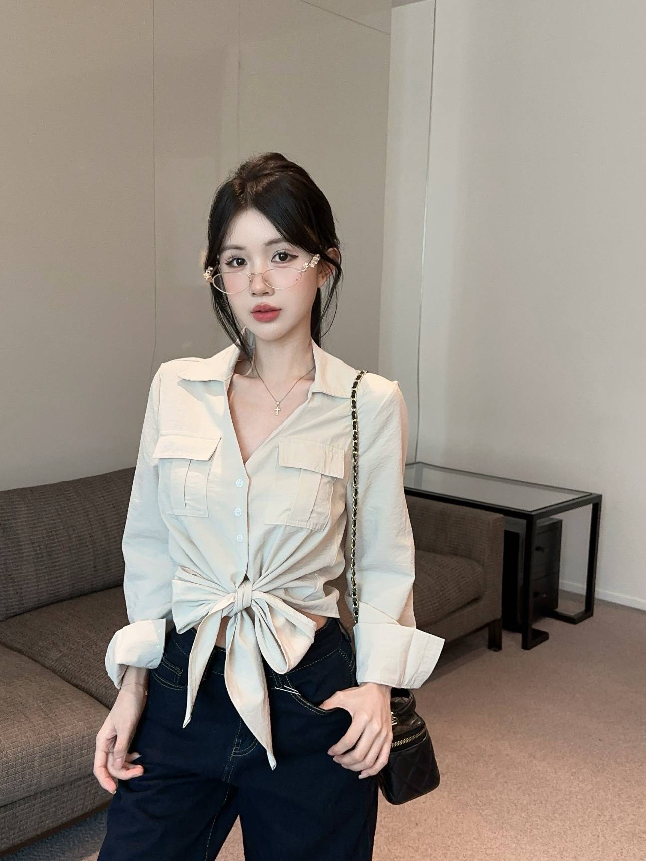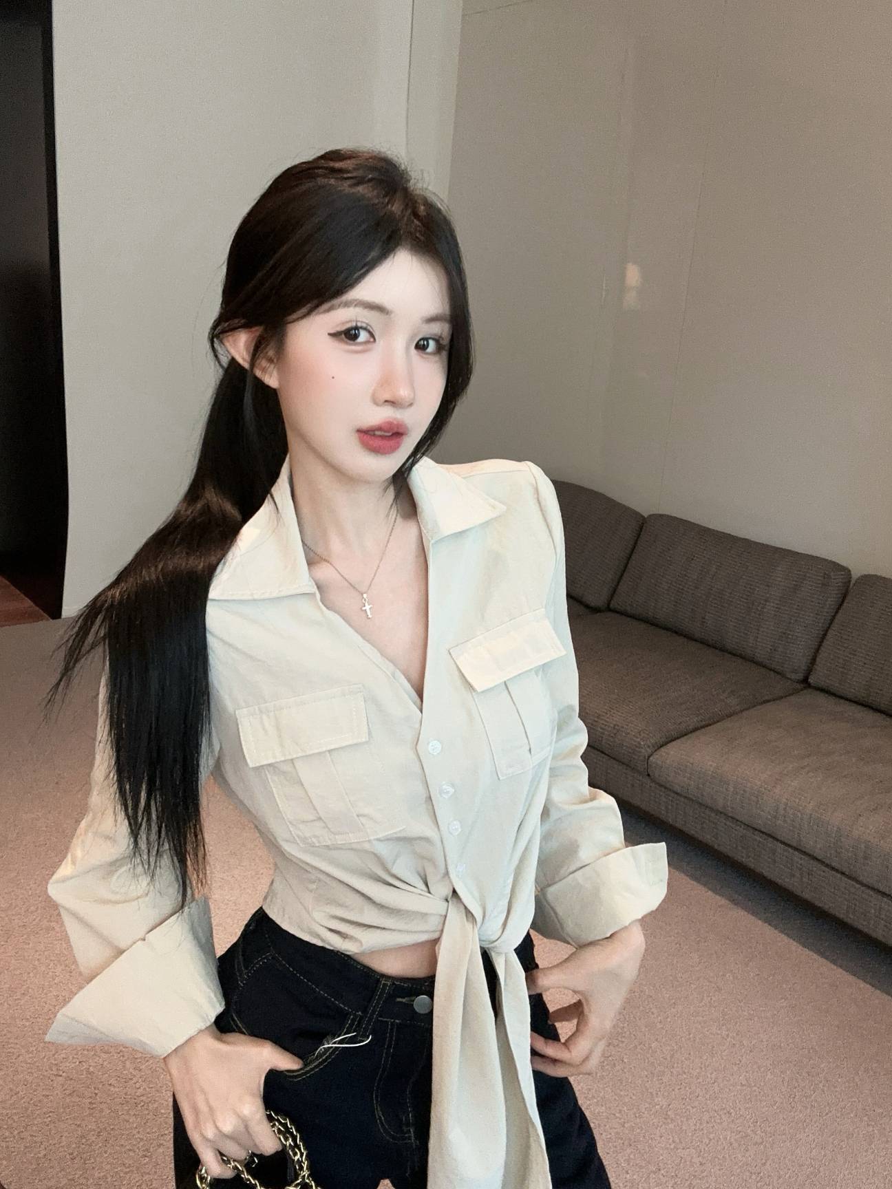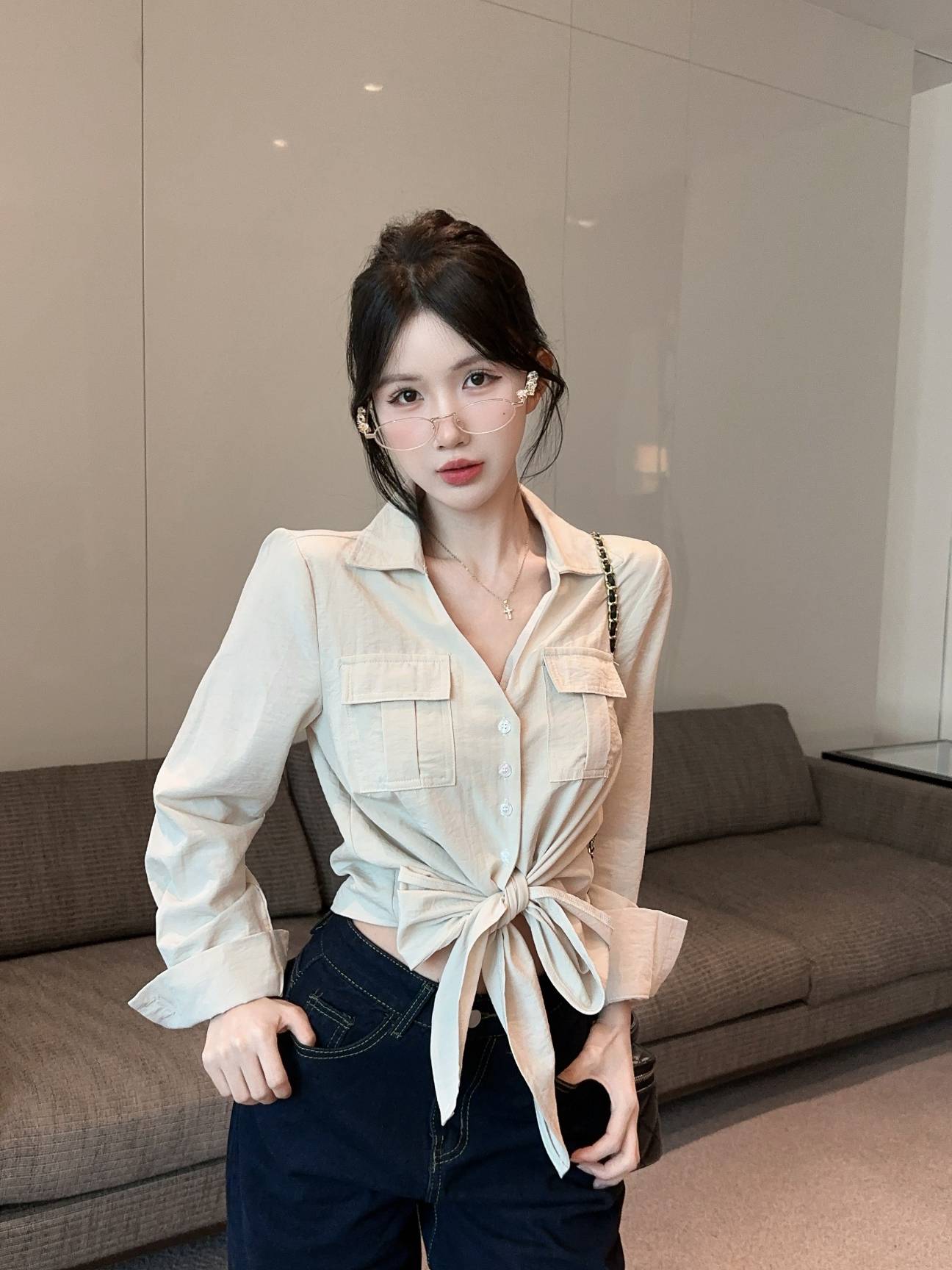 FA53198# 新款纯欲辣妹V领重工设计感双口袋绑带衬衫女 服裝批發女裝批發服飾貨源