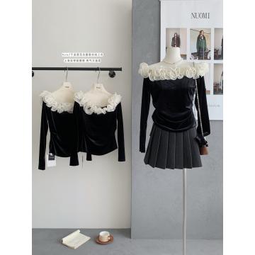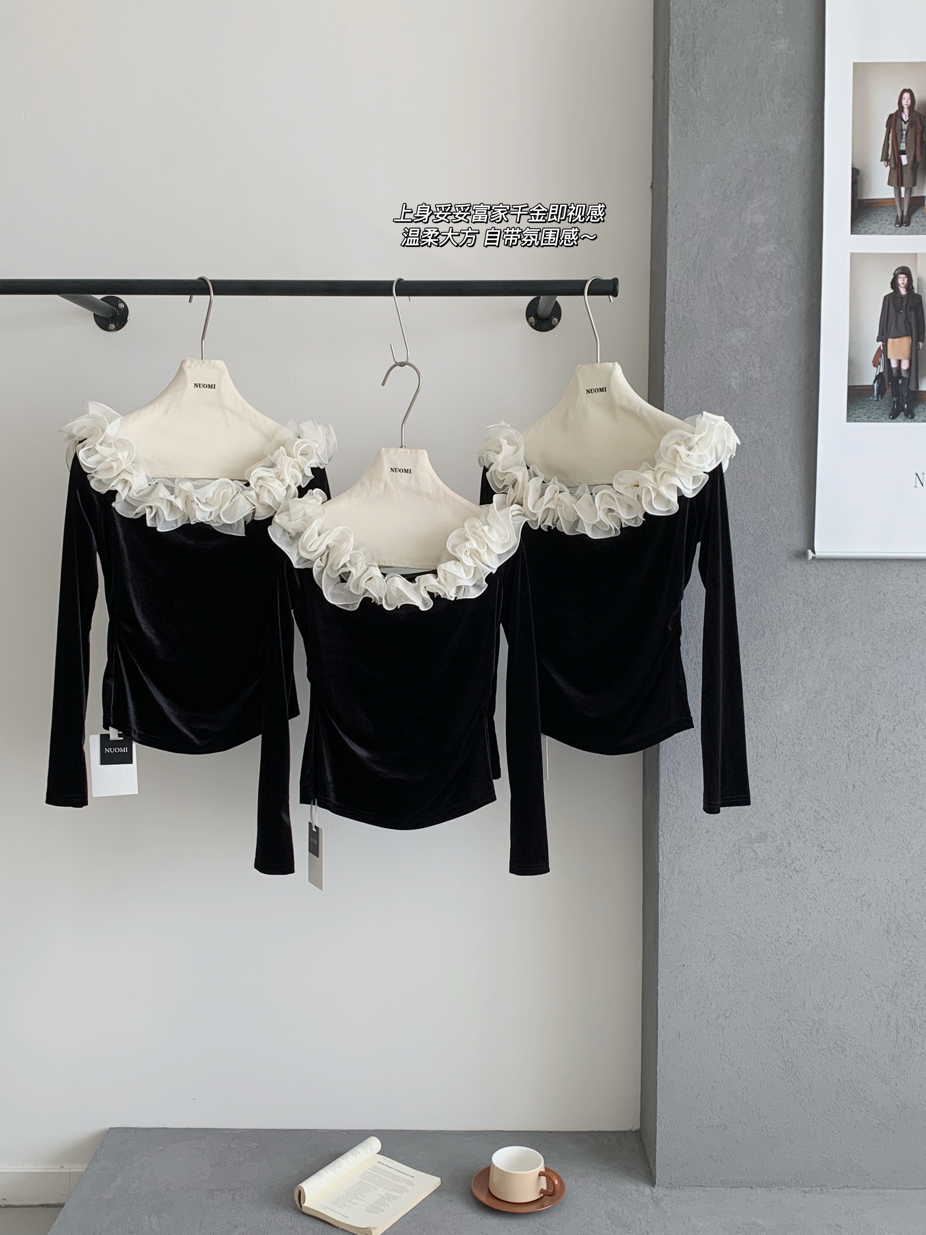 FA53259# 秋冬新款法式名媛绝美气质花边一字领露肩显瘦丝绒小衫 服裝批發女裝批發服飾貨源