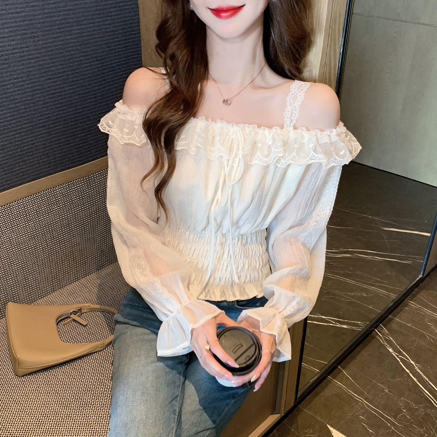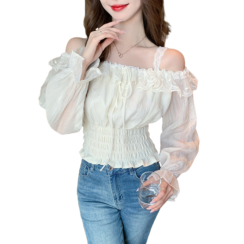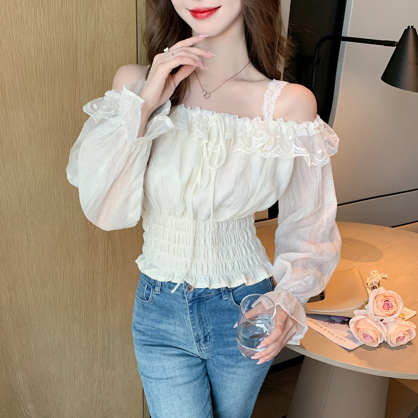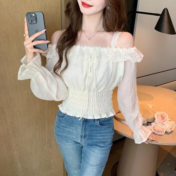 FA53266# 春季荷叶边挂脖长袖雪纺衫设计感收腰显瘦露肩小衫上衣女 服裝批發女裝批發服飾貨源