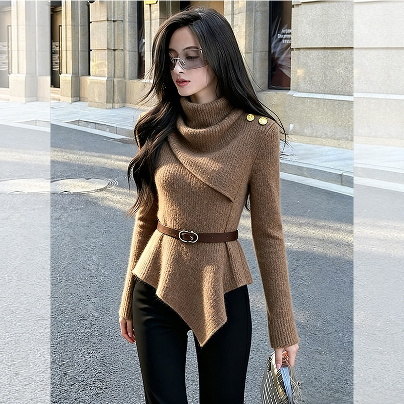 FA53268# 韩系慵懒假两件围脖领咖色针织衫女冬季新款独特气质轻熟上衣 服裝批發女裝批發服飾貨源