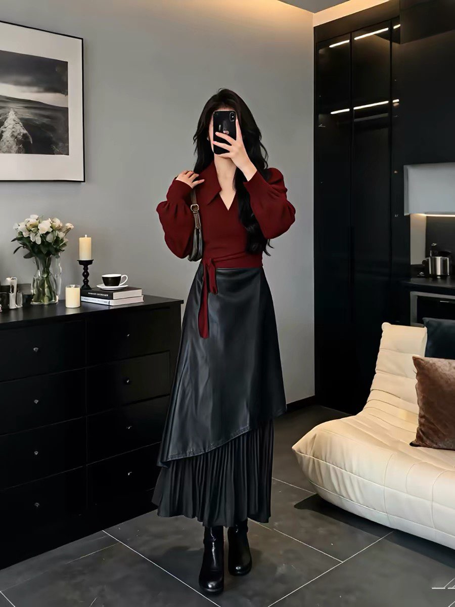 枣红色上衣+黑色皮裙