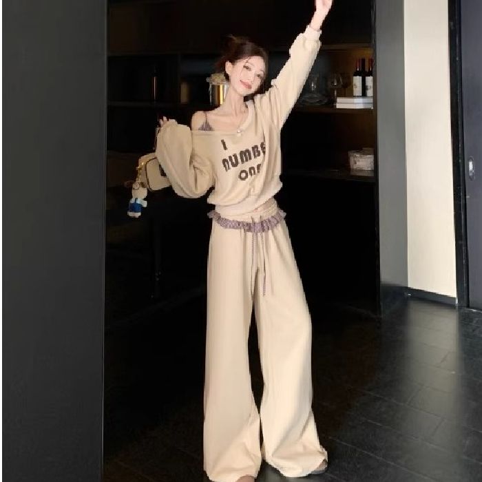 FA53860# 曼巴棉复古长袖斜肩印花卫衣高腰拼接条纹阔腿休闲裤女秋季套装 服裝批發女裝批發服飾貨源