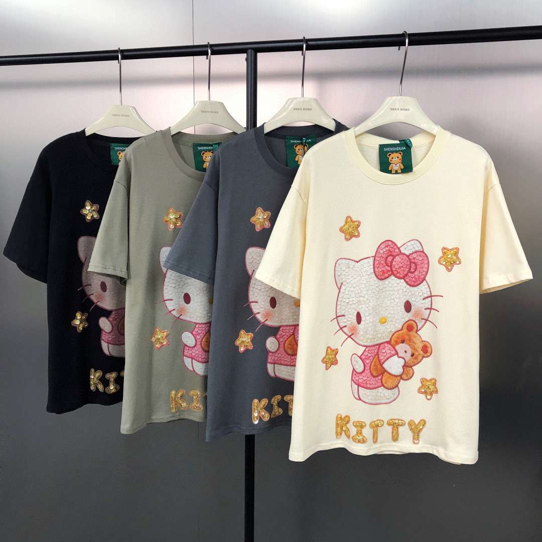 FA53904# 早春!韩系慵懒时尚手工钉珠KT猫印花宽松显瘦百搭短袖T恤 服裝批發女裝批發服飾貨源
