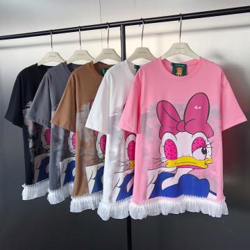 FA53914# 甜酷时尚设计感蕾丝拼接唐老鸭钉珠印花中长款短袖T恤 服裝批發女裝批發服飾貨源