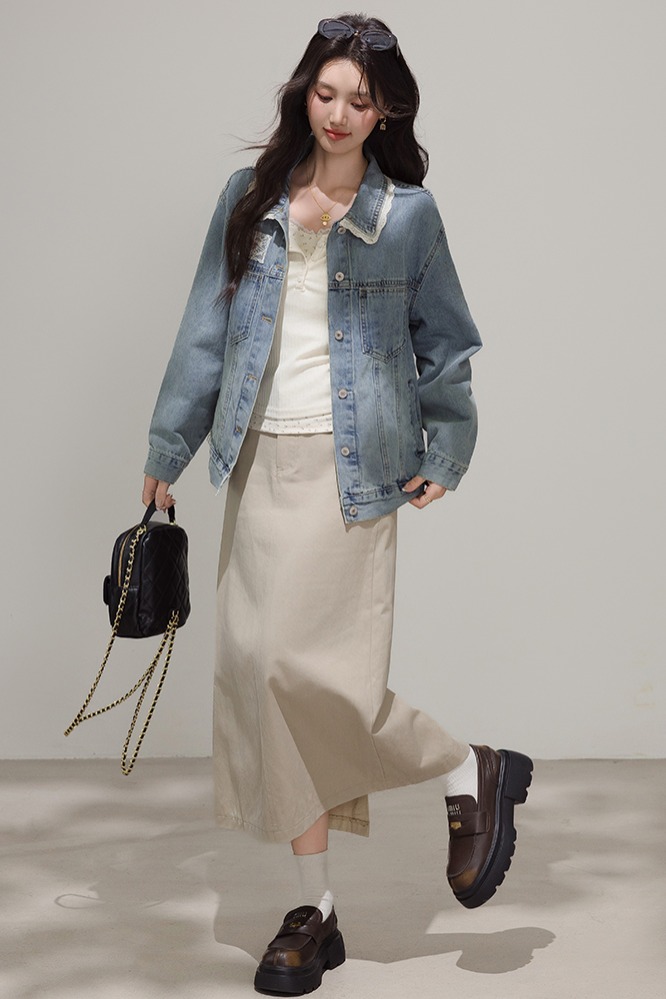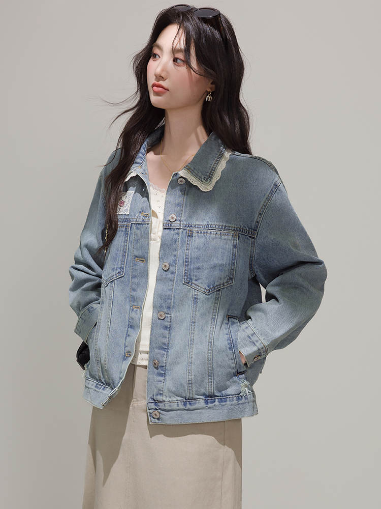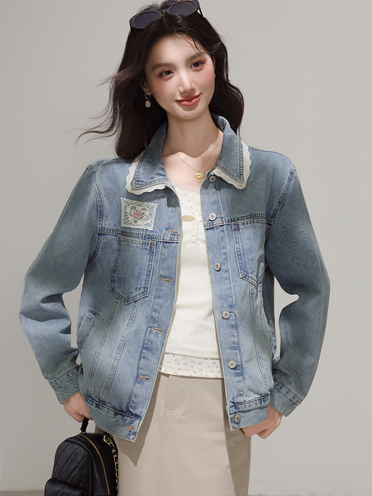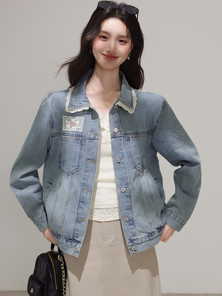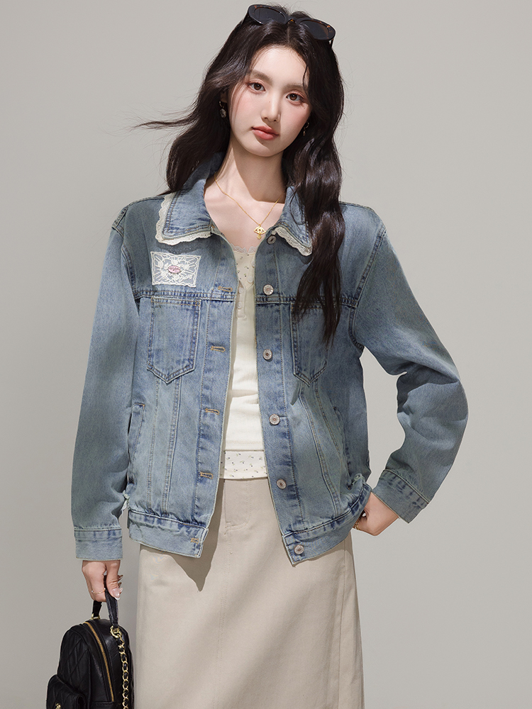 FA53994# 蓝色韩版蕾丝拼接甜美牛仔外套女春季设计感复古夹克上衣 服裝批發女裝批發服飾貨源