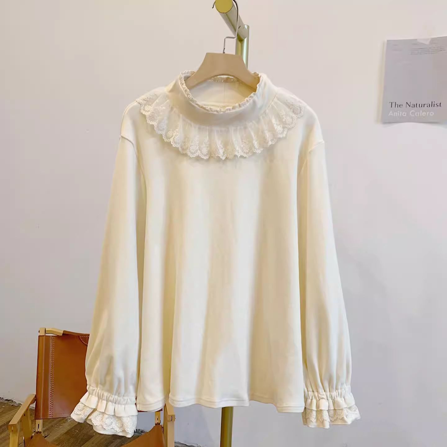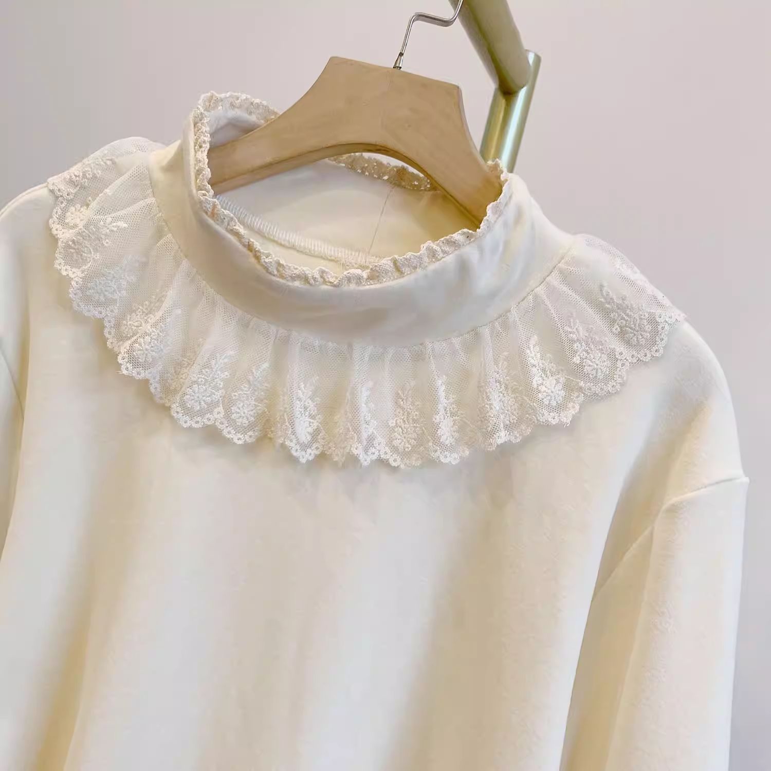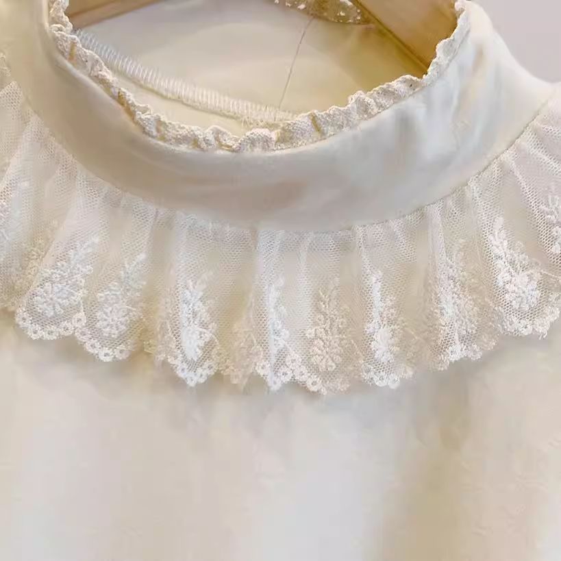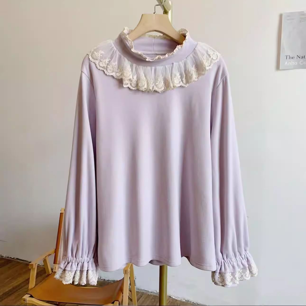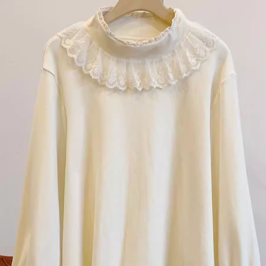 FA54240# 新款大码木耳领泡泡袖德绒弹力蕾丝边半高领打底长袖上衣保暖T恤 服裝批發女裝批發服飾貨源