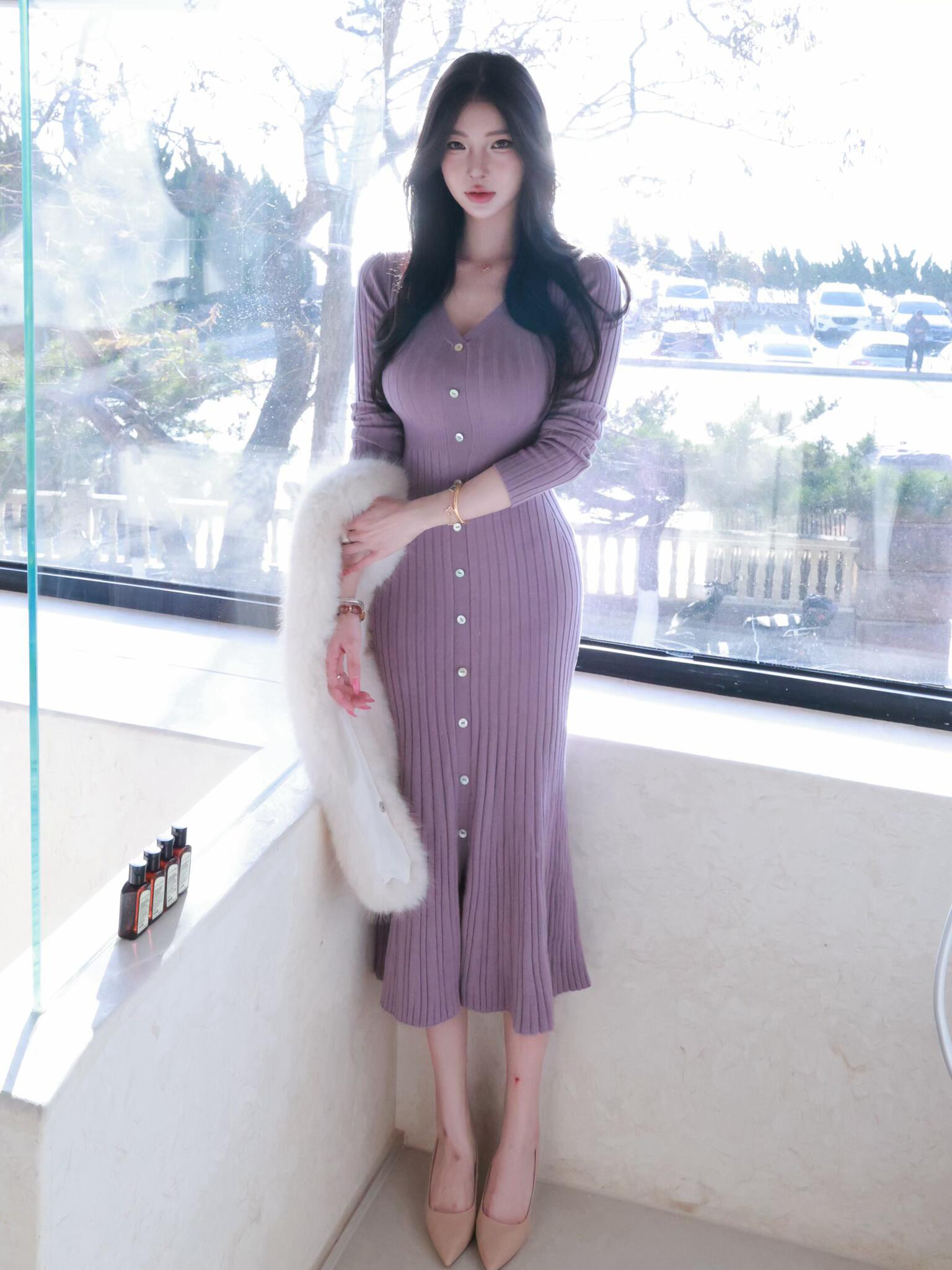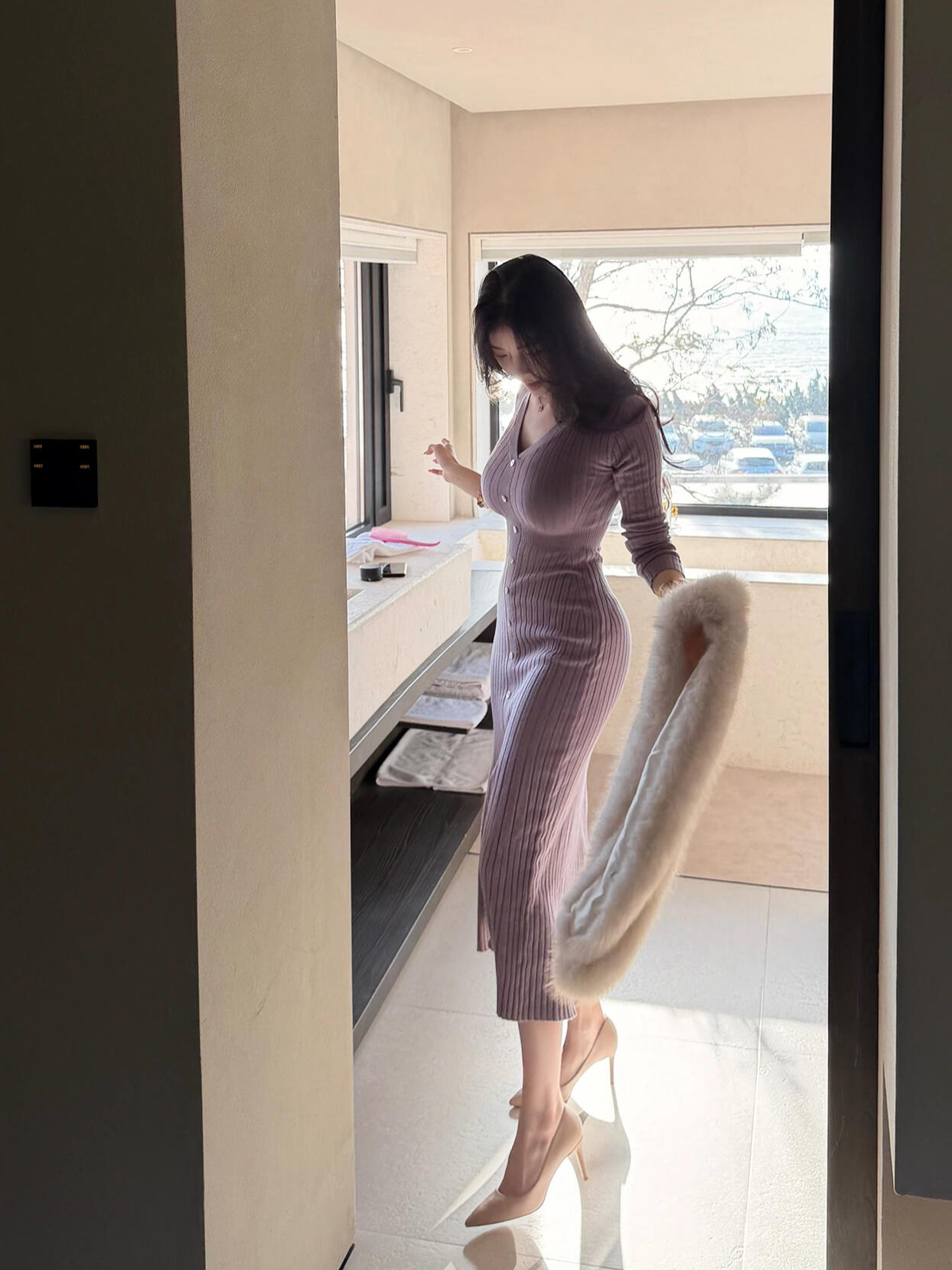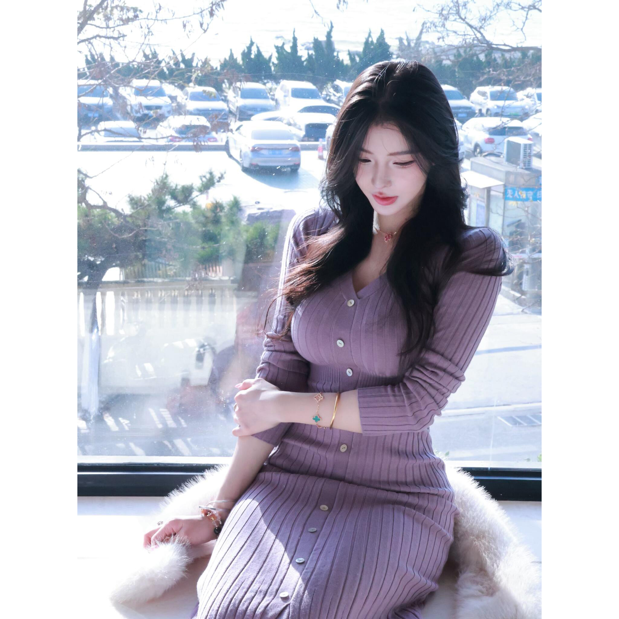 FA54371# 丁香情愫羊毛V领针织鱼尾连衣裙秋冬圣诞包臀裙 服裝批發女裝批發服飾貨源