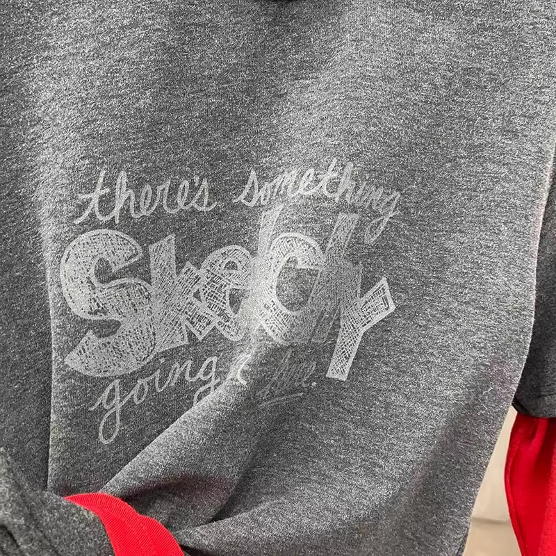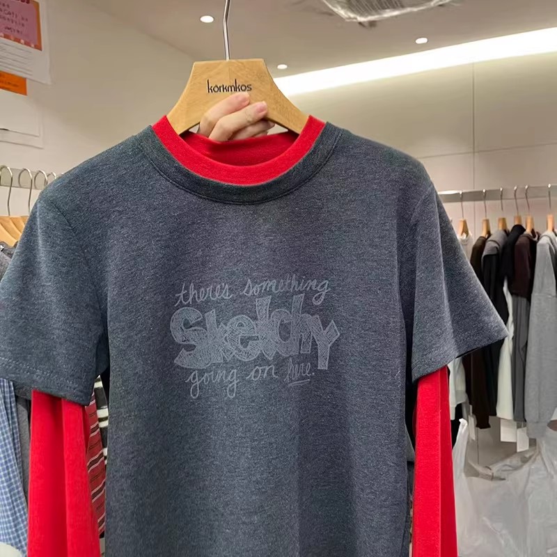 FA54435# 韩国春季新款字母印花拼接红色长袖假两件磨毛T恤女欧货上衣 服裝批發女裝批發服飾貨源