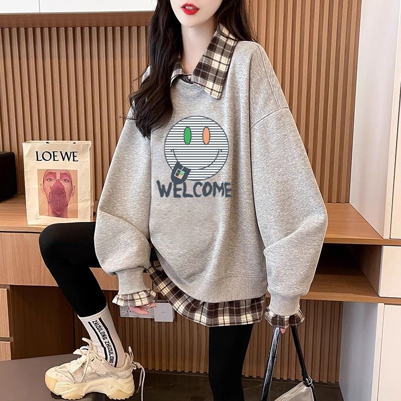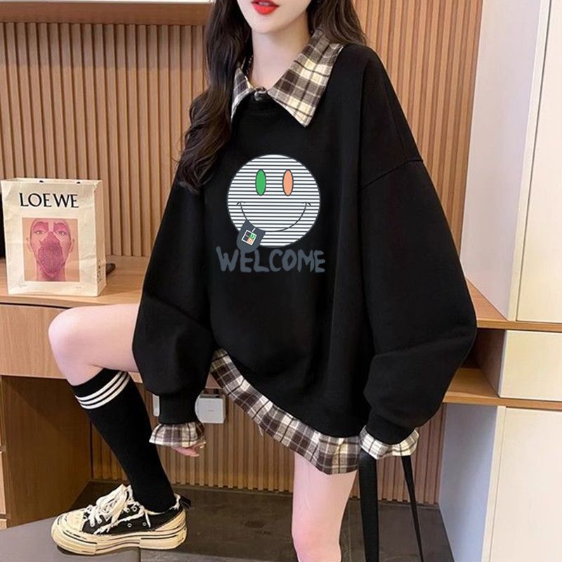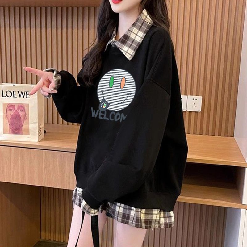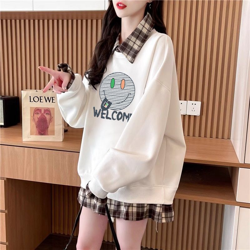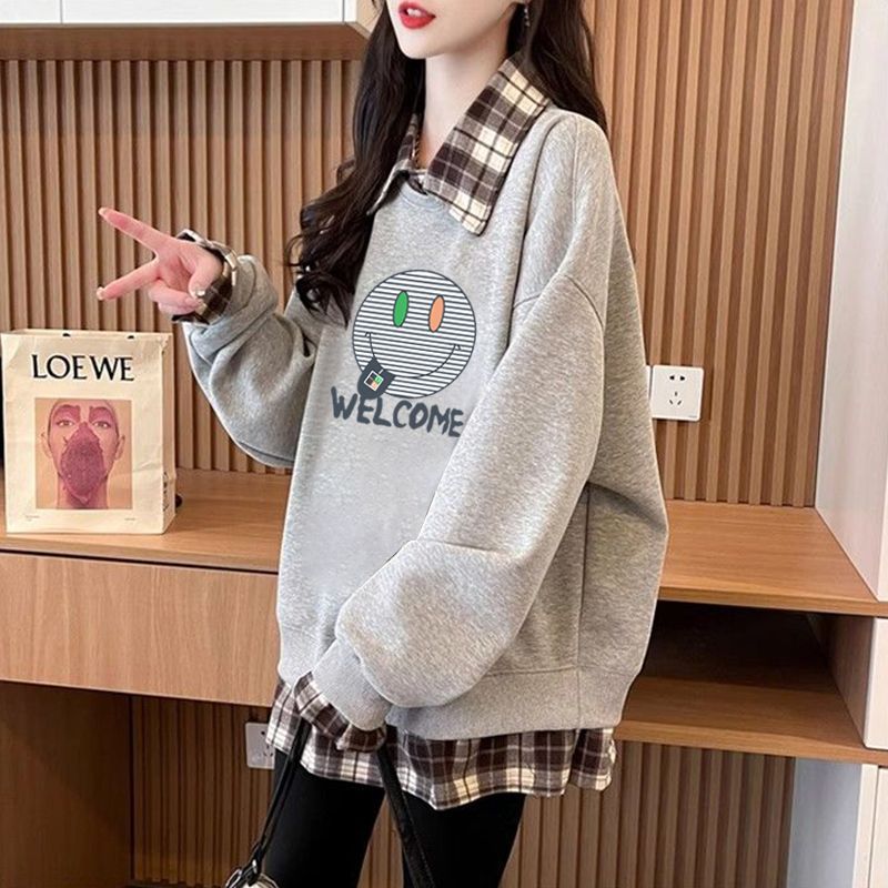 FA54440# 华棉复后包领韩版格子拼接印花卫衣春装上衣女大码 服裝批發女裝批發服飾貨源