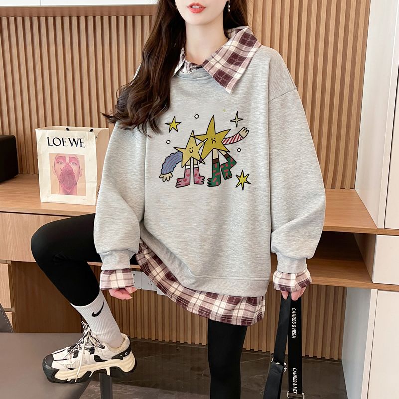 FA54442# 华棉复后包领韩版格子拼接印花卫衣春装上衣女大码 服裝批發女裝批發服飾貨源