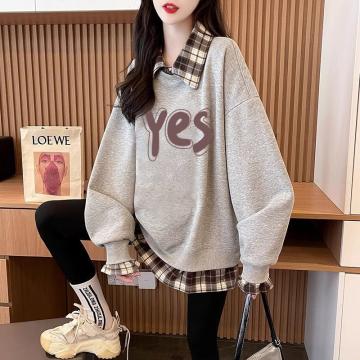 FA54443# 华棉复后包领韩版格子拼接印花卫衣春装上衣女大码 服裝批發女裝批發服飾貨源