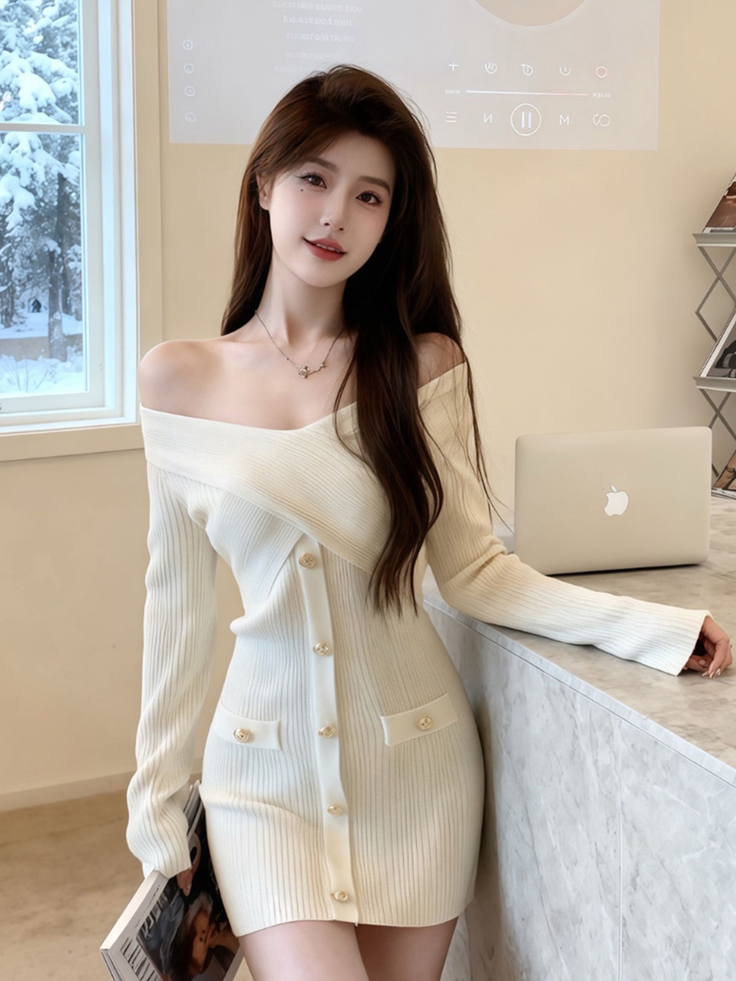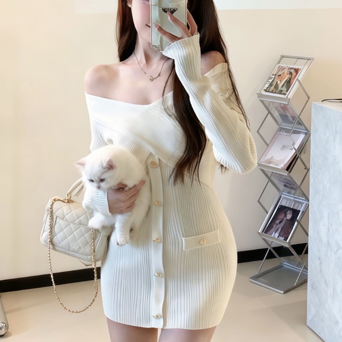 FA54553# 韩国一字领露肩针织毛衣连衣裙女春小个子心机夜店OL小香风打底裙 服裝批發女裝批發服飾貨源