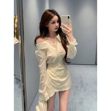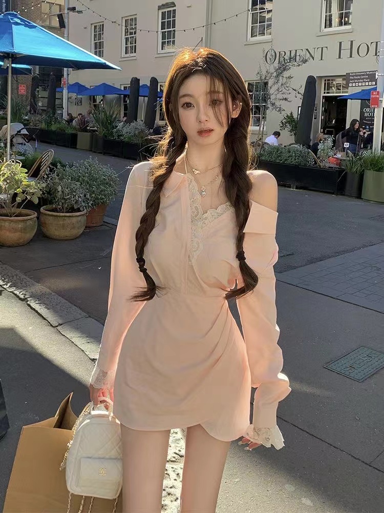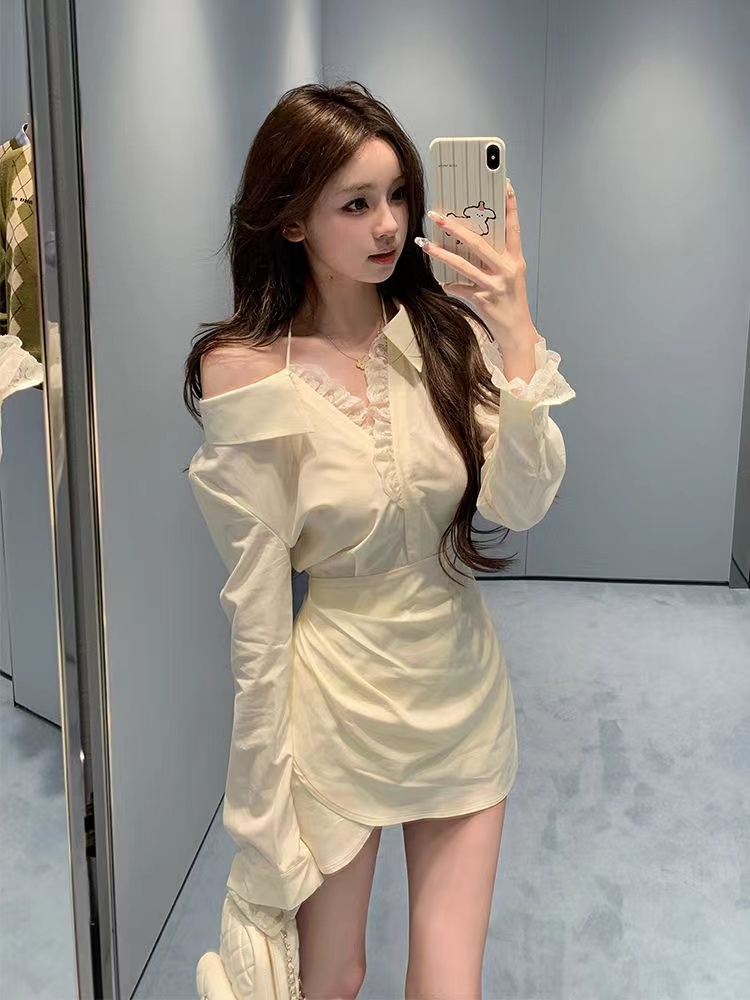 FA54617# 纯欲风露肩长袖衬衫连衣裙女初秋新款蕾丝拼接显瘦法式收腰短裙子 服裝批發女裝批發服飾貨源