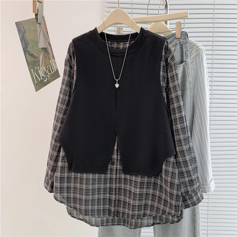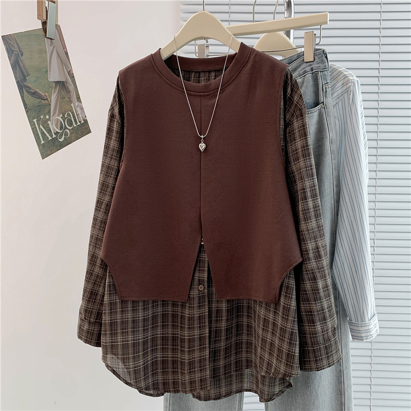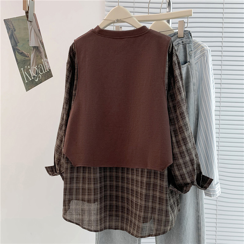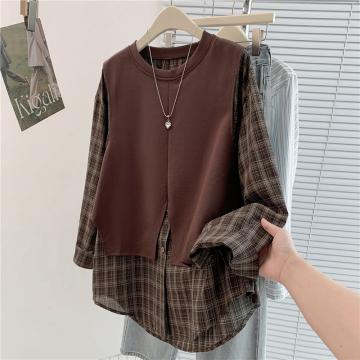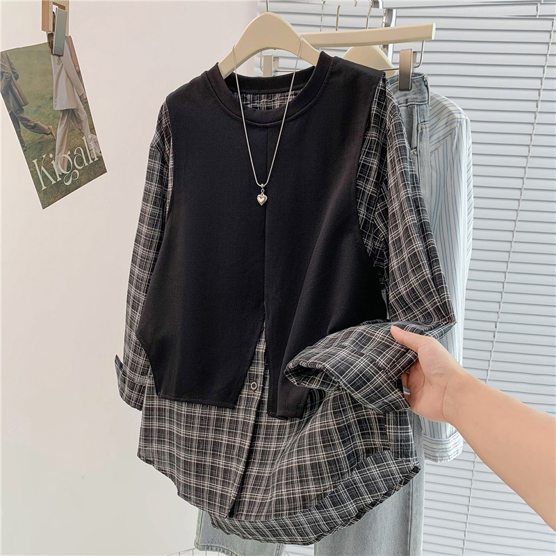 FA54658# 设计感小众格子长袖衬衫拼接卫衣秋季新款宽松假两件上衣女 服裝批發女裝批發服飾貨源