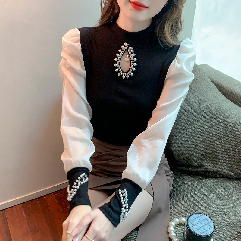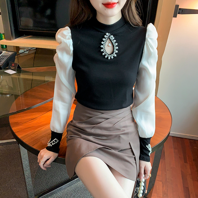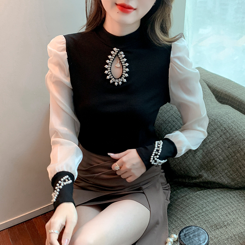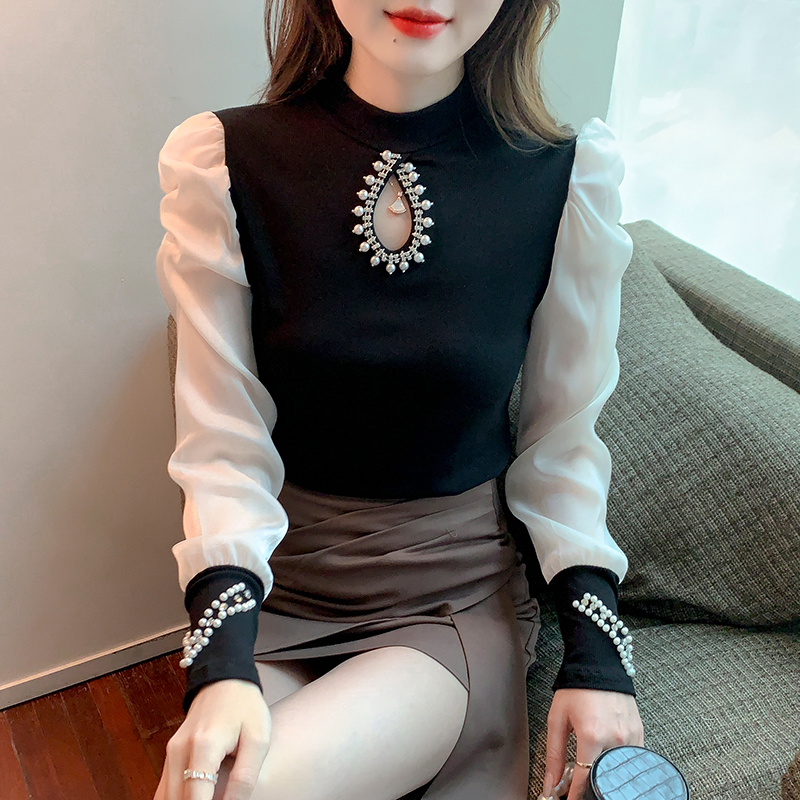 FA54710# 秋季镂空小心机重工钉珠拼接雪纺衫修身长袖上衣 服裝批發女裝批發服飾貨源