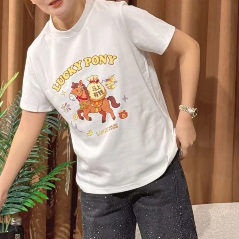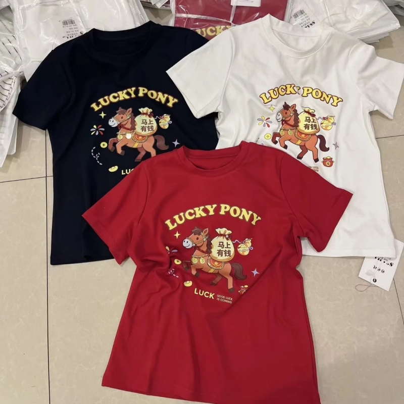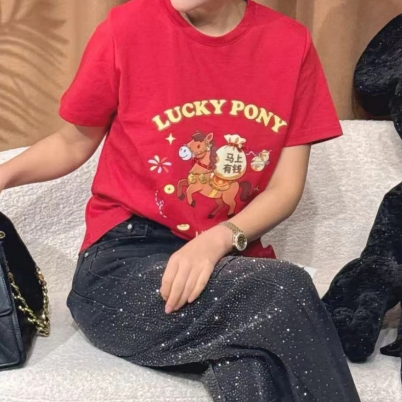 FA54723# 法式设计感小马印花短袖T恤春季新款本命年红色显瘦上衣 服裝批發女裝批發服飾貨源