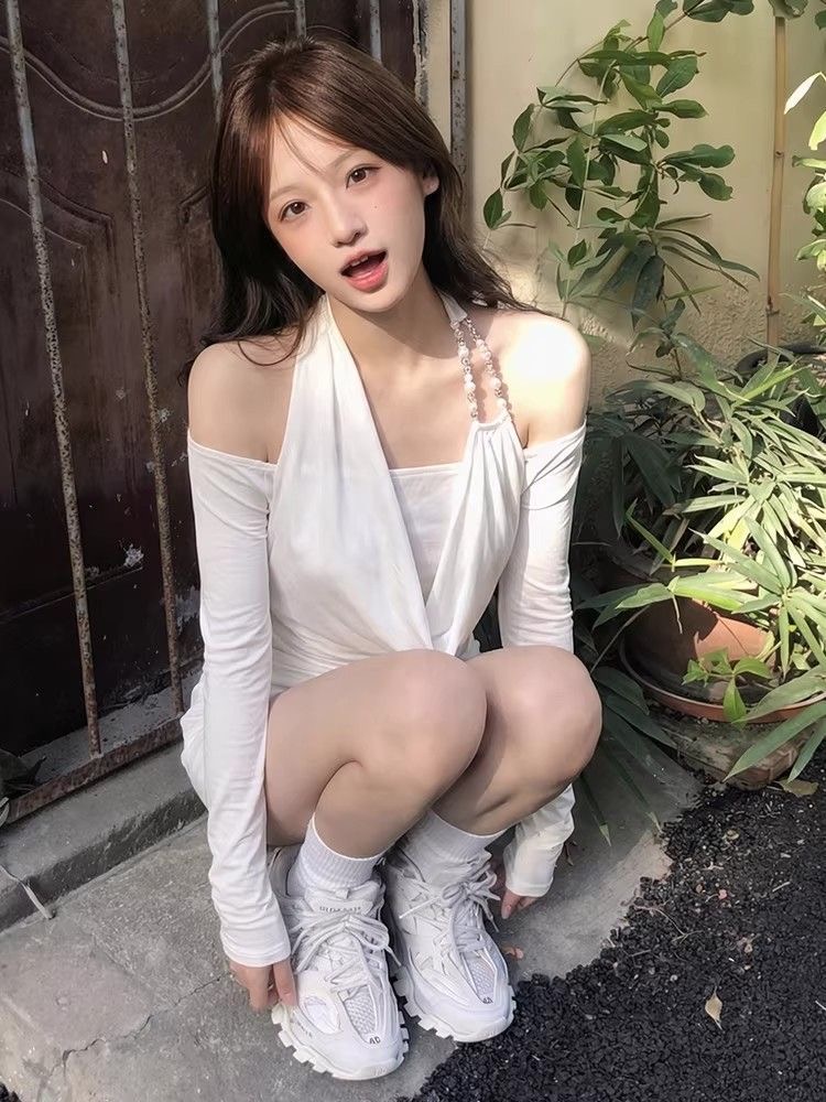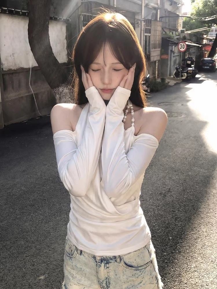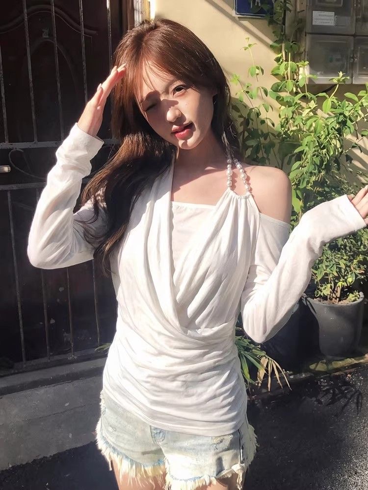 FA54804# 蜜桃家新品设计感荡领假两件挂脖白色长袖t恤女秋冬修身显瘦上衣 服裝批發女裝批發服飾貨源