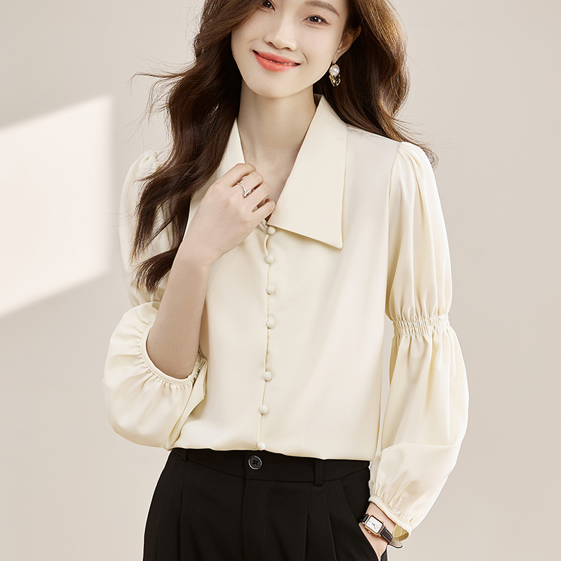 FA55086# 法式复古V领泡泡袖衬衫女春秋季新款设计感长袖衬衣别致上衣 服裝批發女裝批發服飾貨源