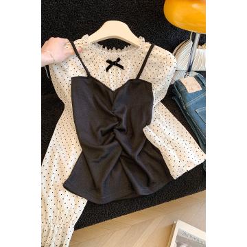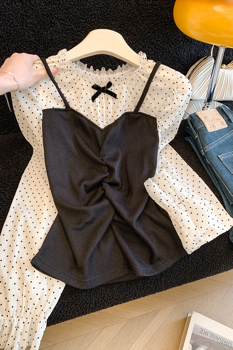 FA55104# 韩系早春新款针织拼接假两件衬衫女法式别致波点蝴蝶结上衣 服裝批發女裝批發服飾貨源