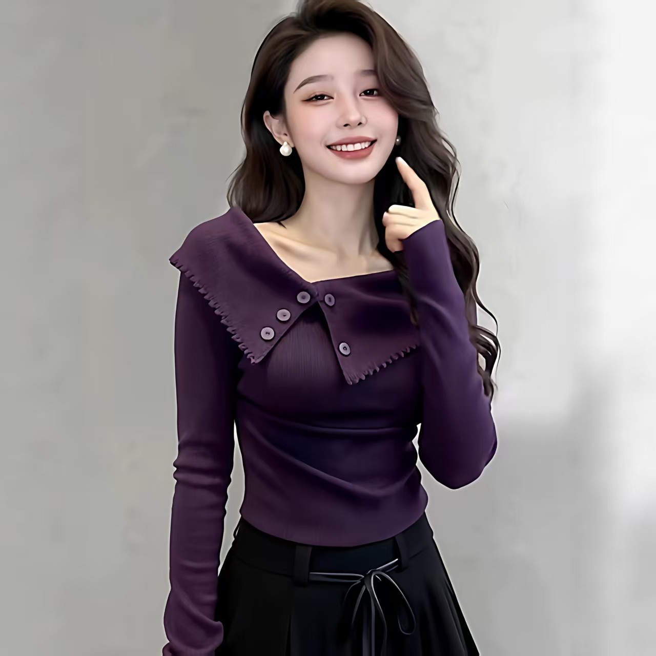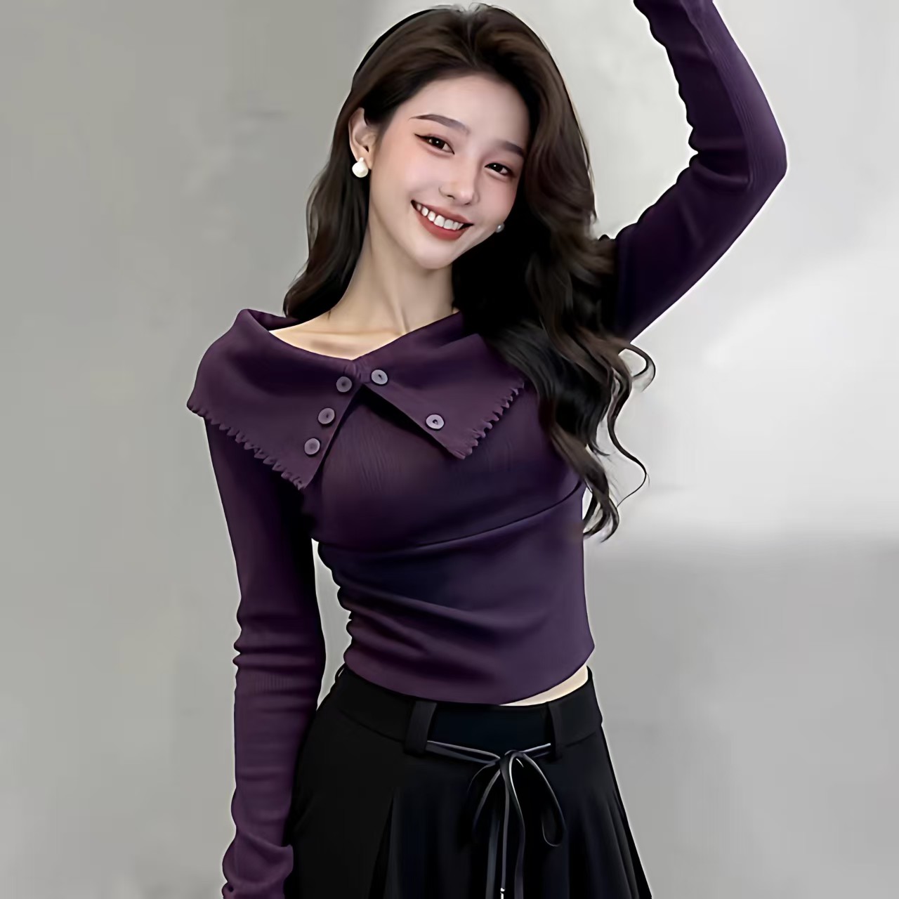 FA55458# 紫色翻领露锁骨女秋季新款内搭打底衫上衣T恤 服裝批發女裝批發服飾貨源