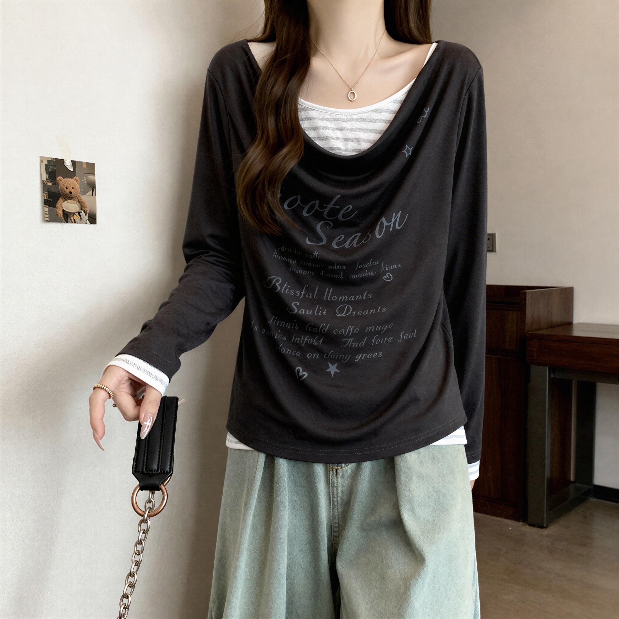 FA55468# 大码胖mm纯棉美式假两件拼接长袖T恤女秋季收腰修身显瘦别致上衣 服裝批發女裝批發服飾貨源