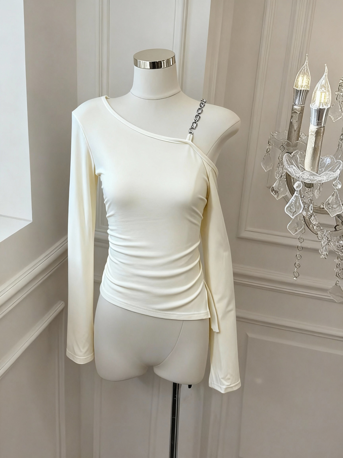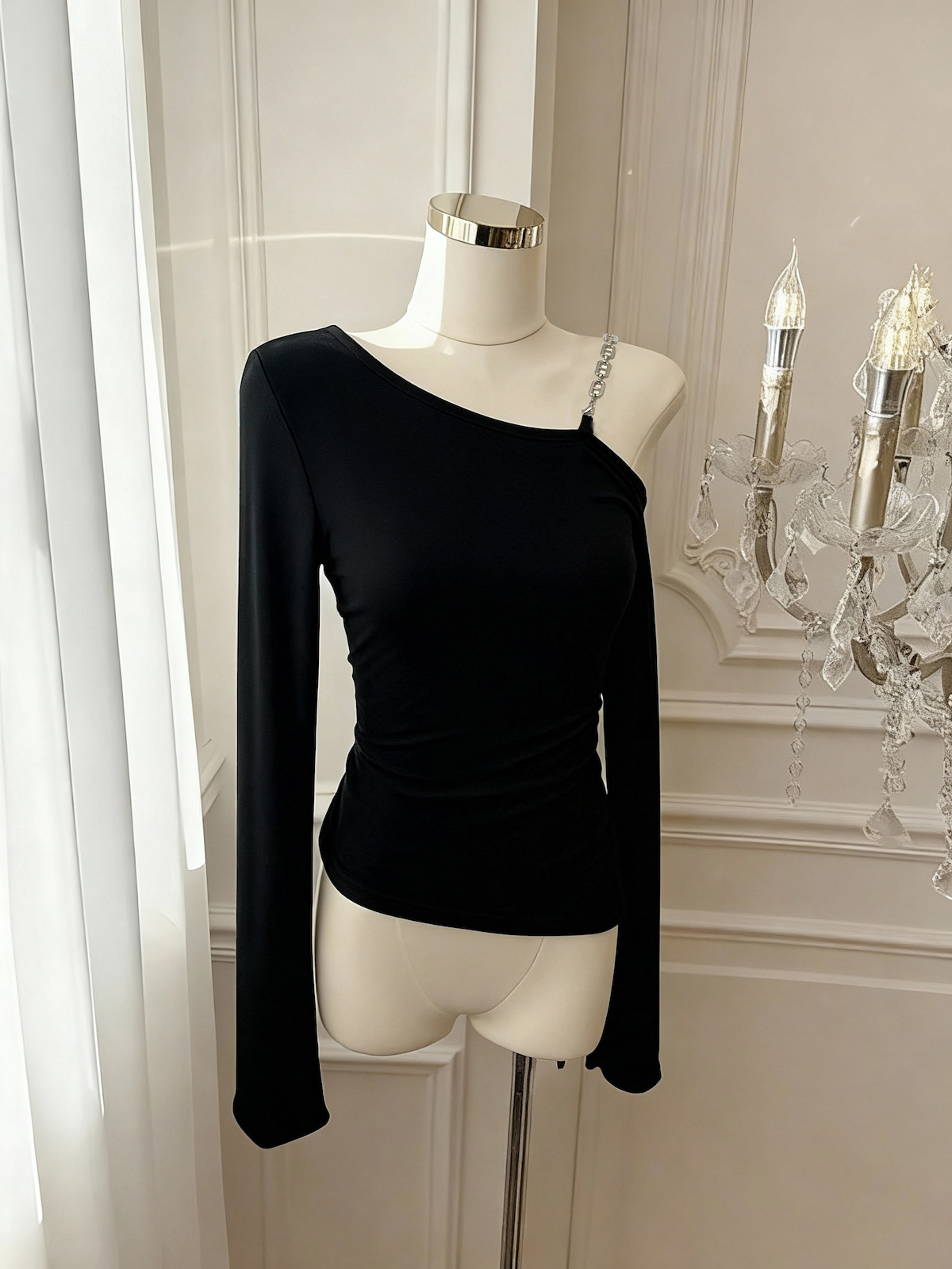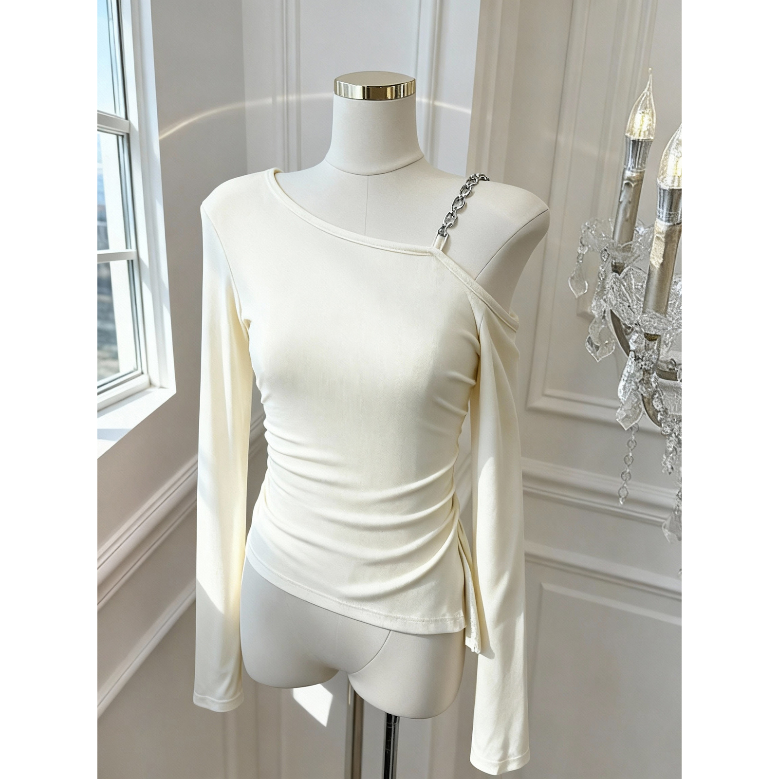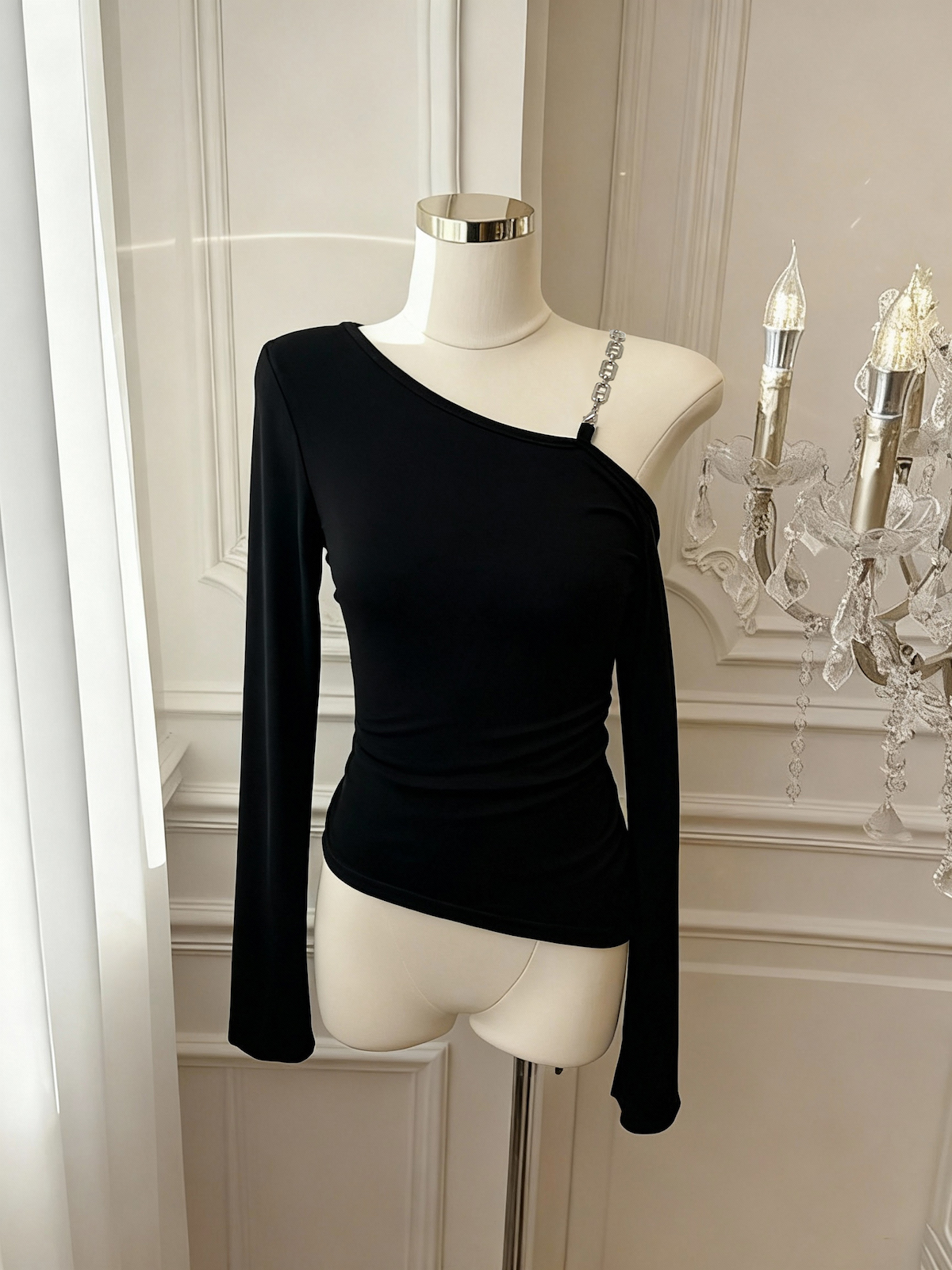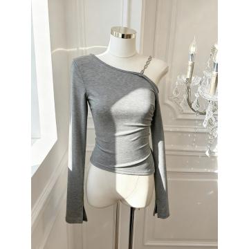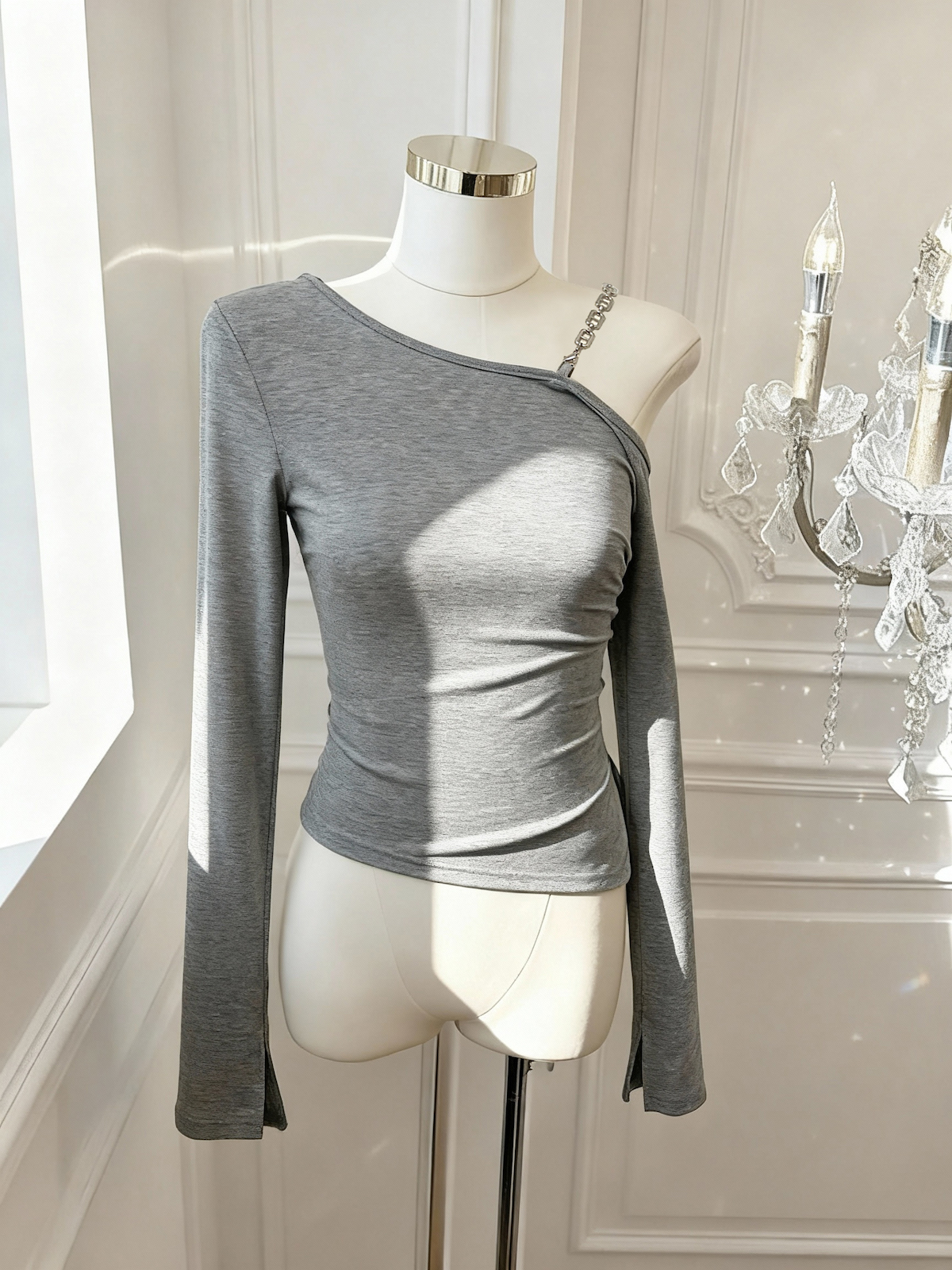 FA55532# 纯欲辣妹露肩长袖T恤女修身斜肩不规则设计感开叉上衣 服裝批發女裝批發服飾貨源