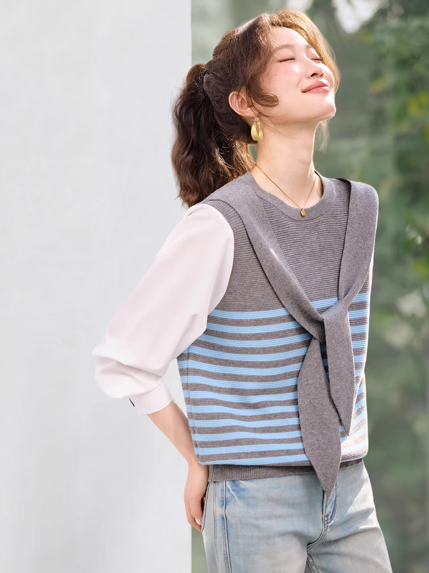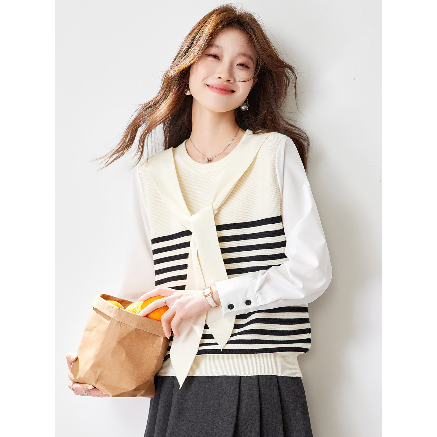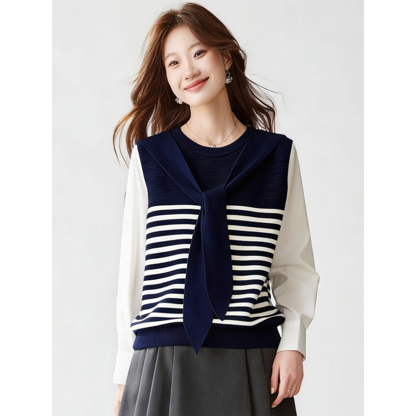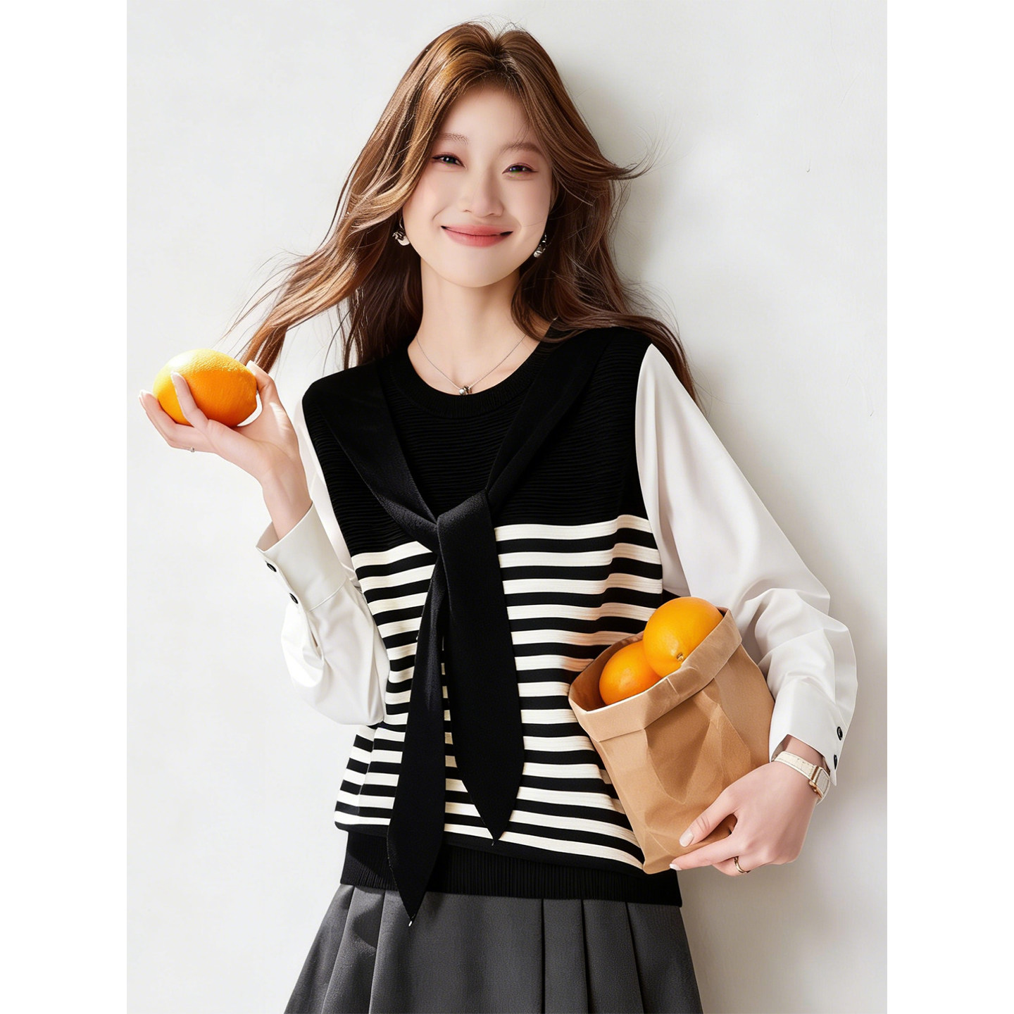 FA55823# 今年流行漂亮的衬衫袖拼接针织衫上衣女早春新款休闲宽松小衫 服裝批發女裝批發服飾貨源
