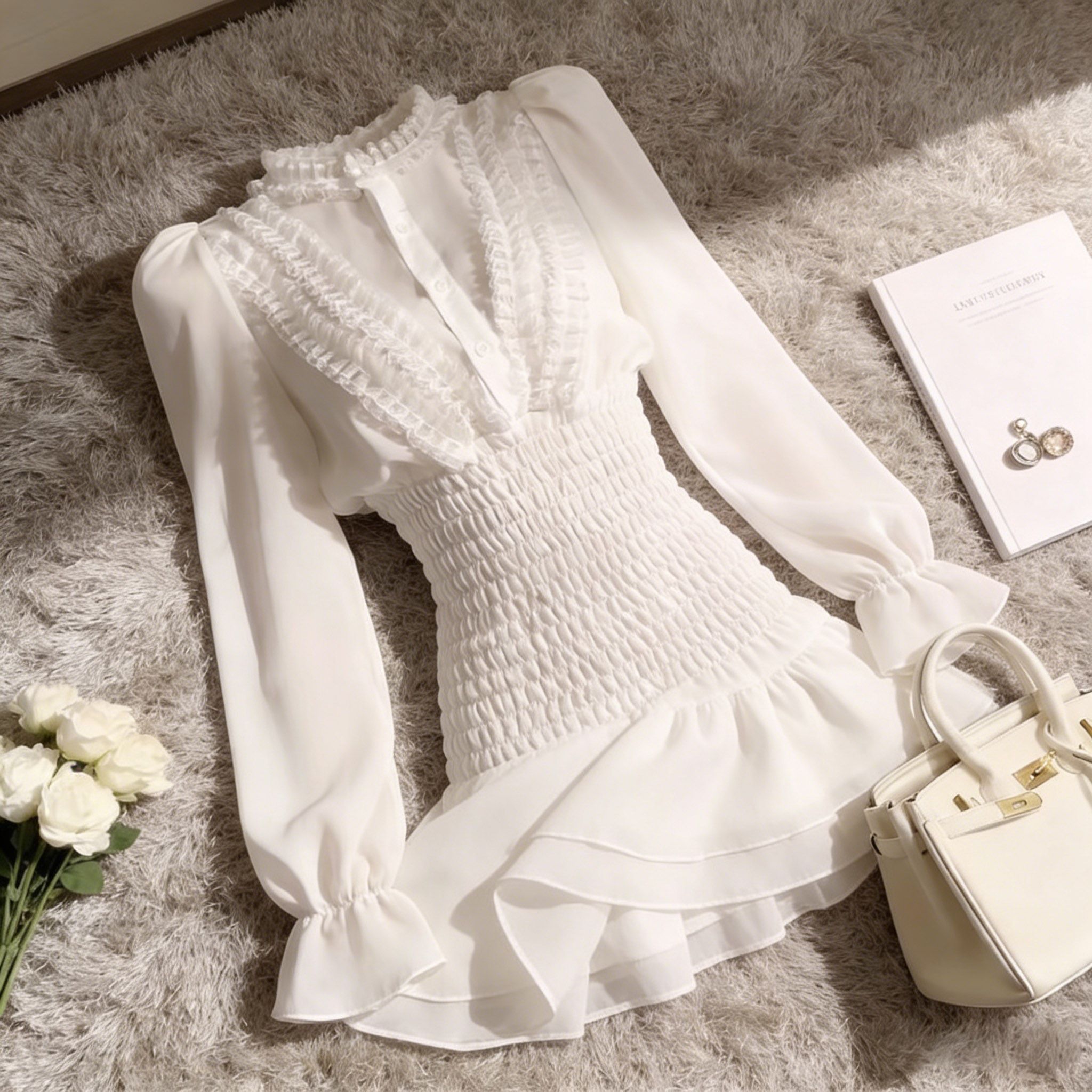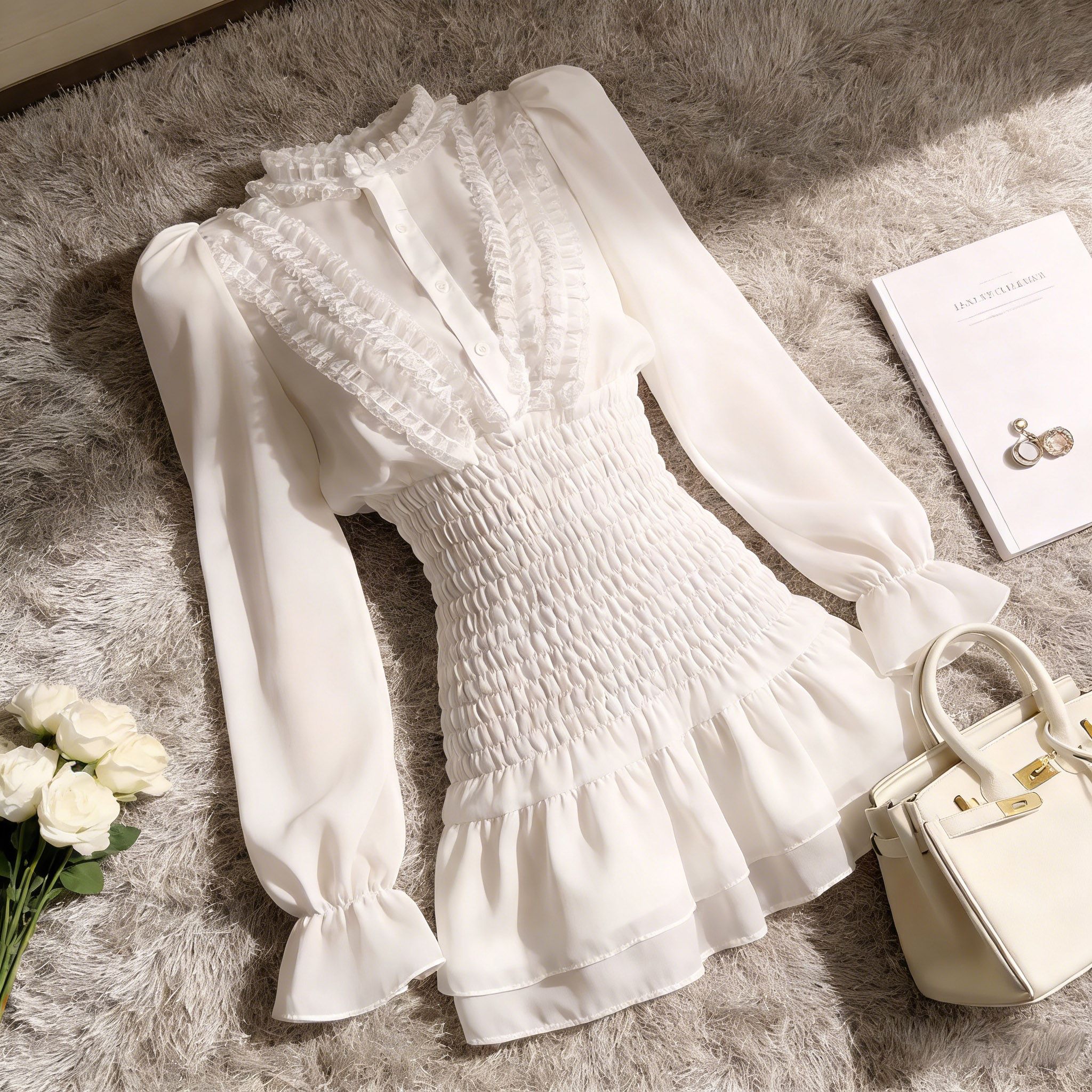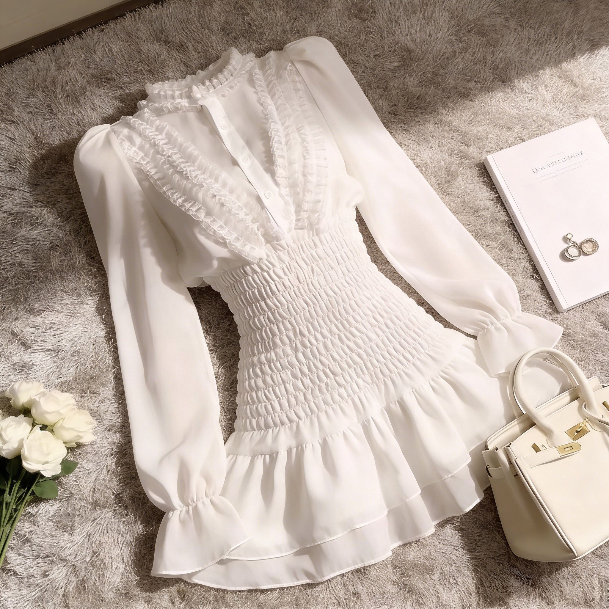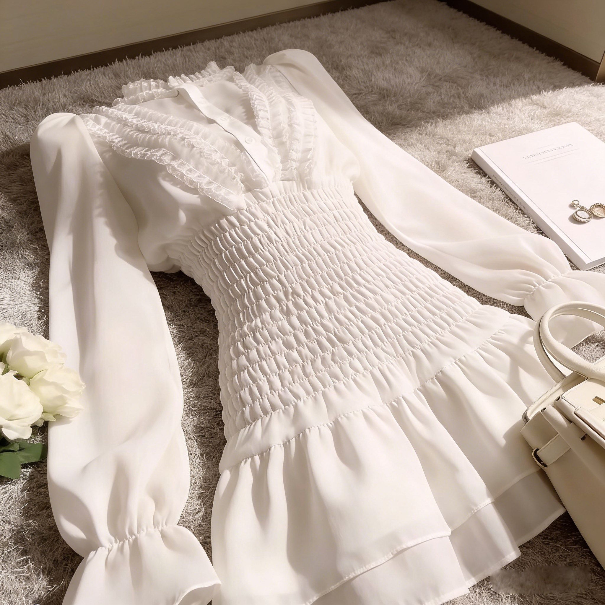 FA55831# 秋季荷叶边长袖雪纺衬衫连衣裙夏季褶皱气质高级感收腰仙女短裙子 服裝批發女裝批發服飾貨源