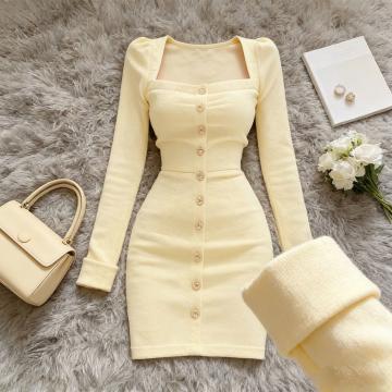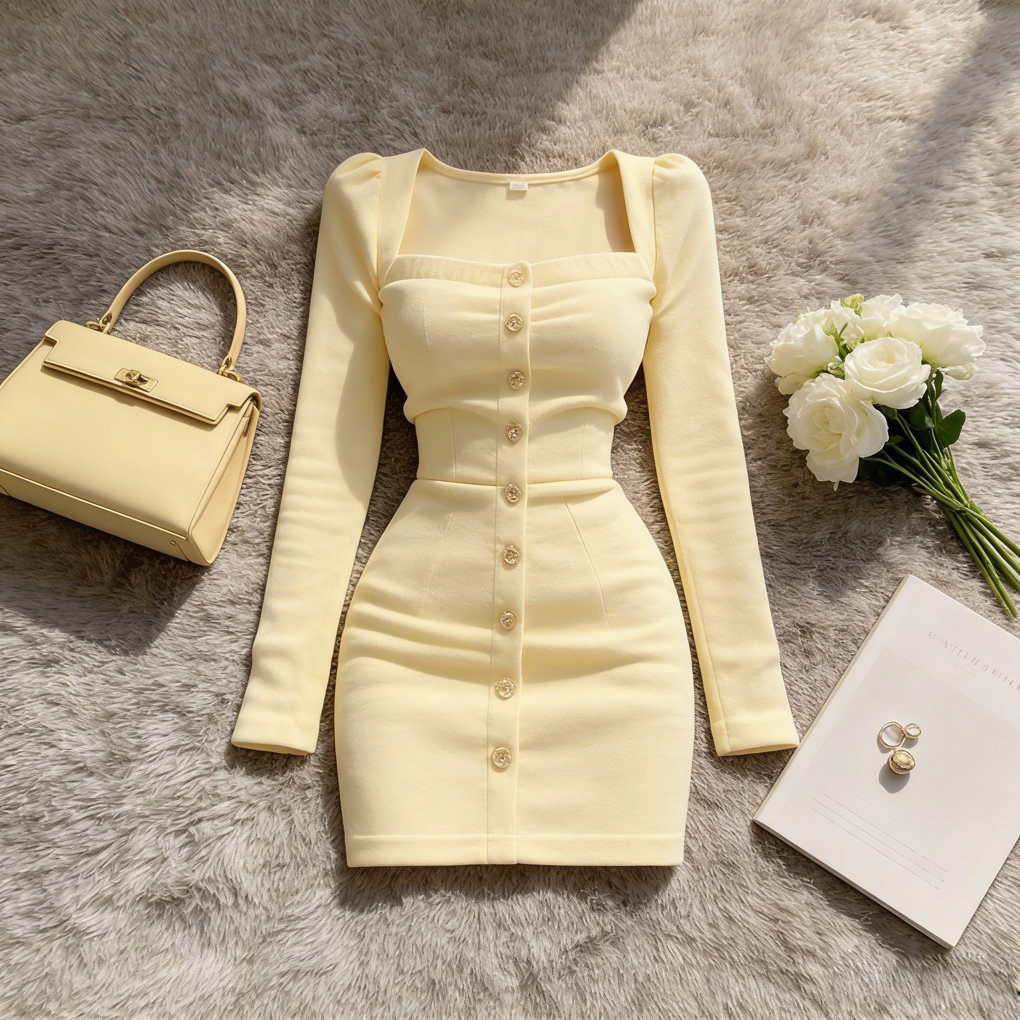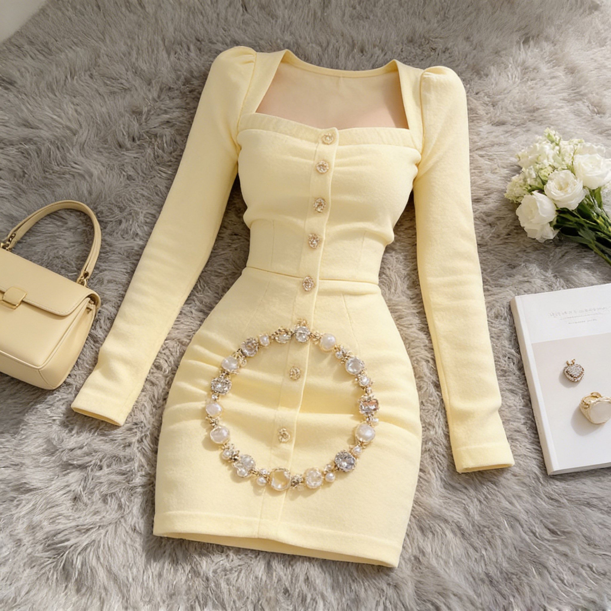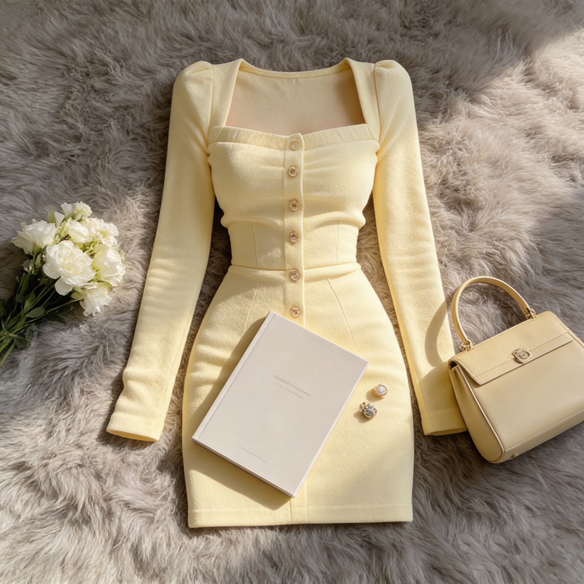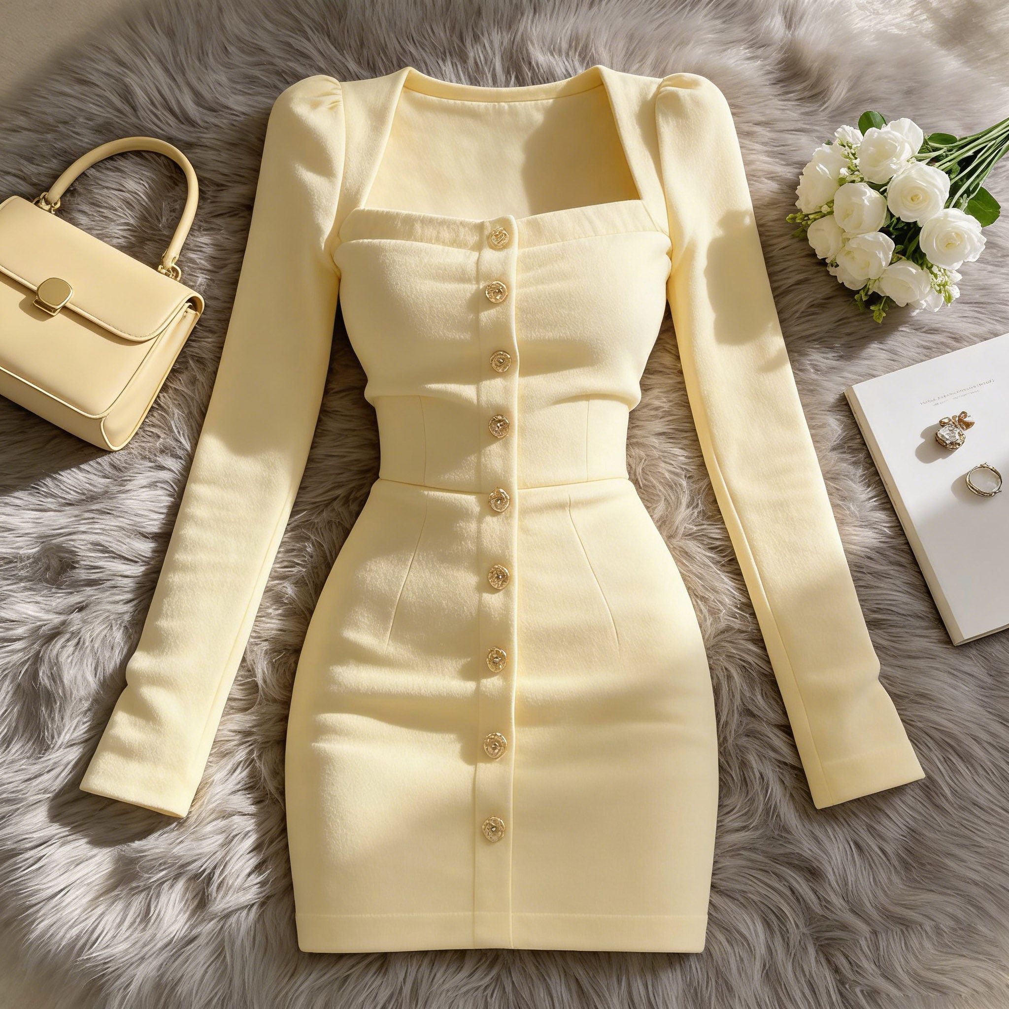 FA55833# 气质御姐风方领单排扣长袖连衣裙女轻奢高级感名媛收腰显瘦包臀裙 服裝批發女裝批發服飾貨源