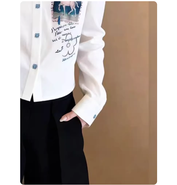FA55839# 法式印花拼接polo领白色长袖衬衫女高级设计感收腰短款上衣早春季 服裝批發女裝批發服飾貨源