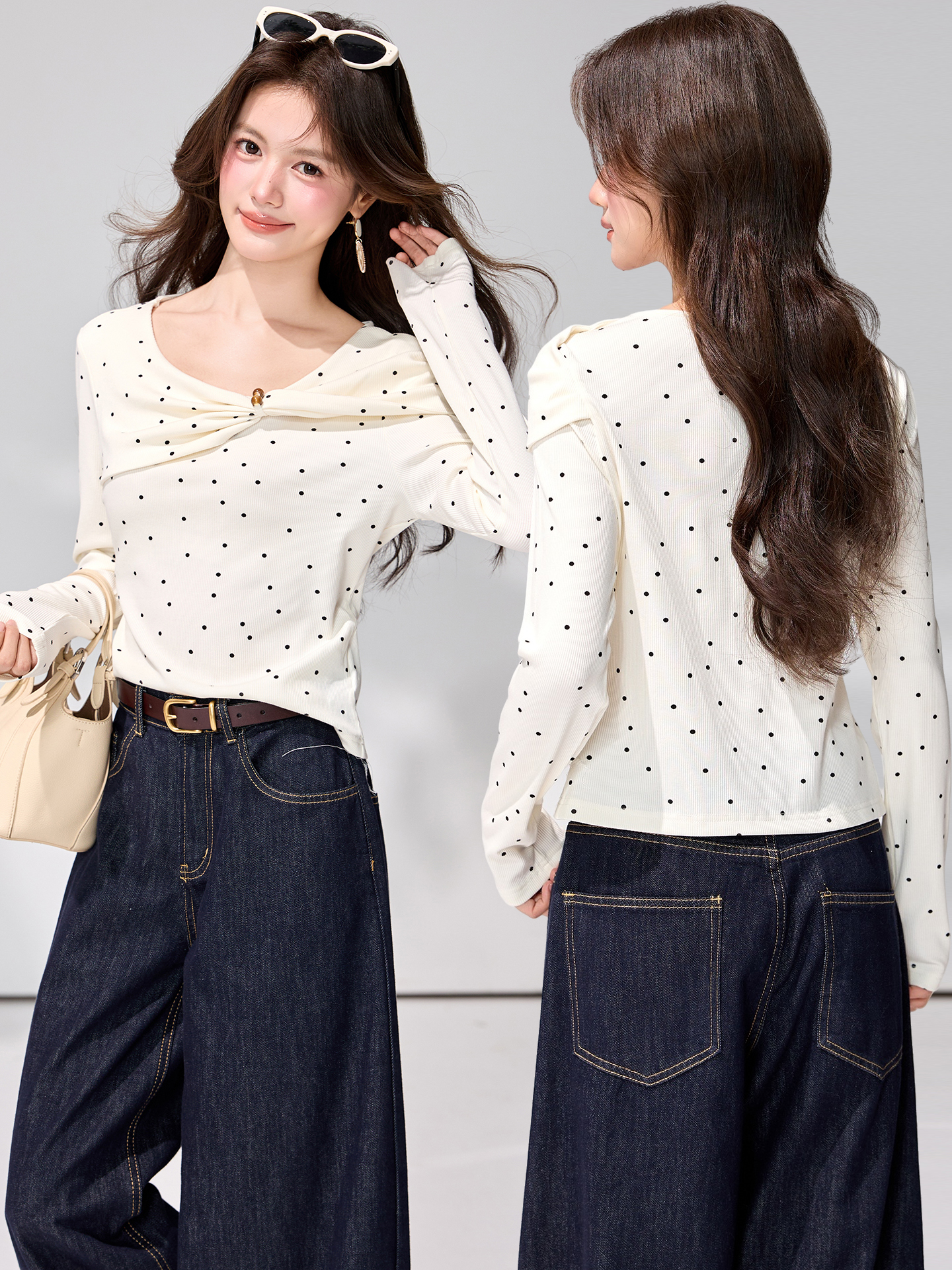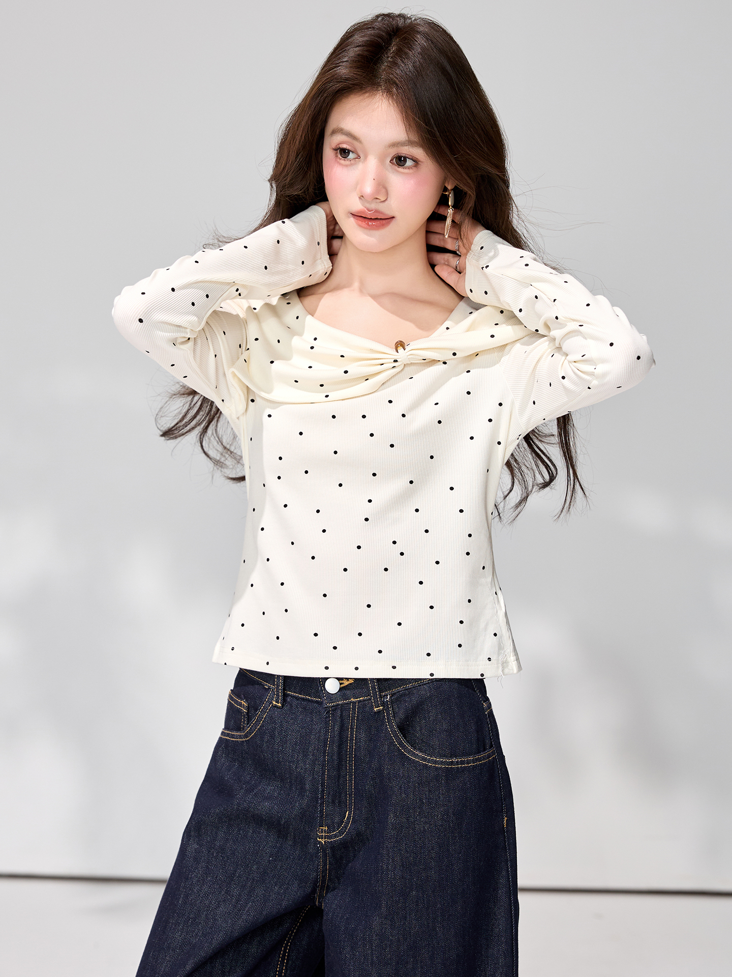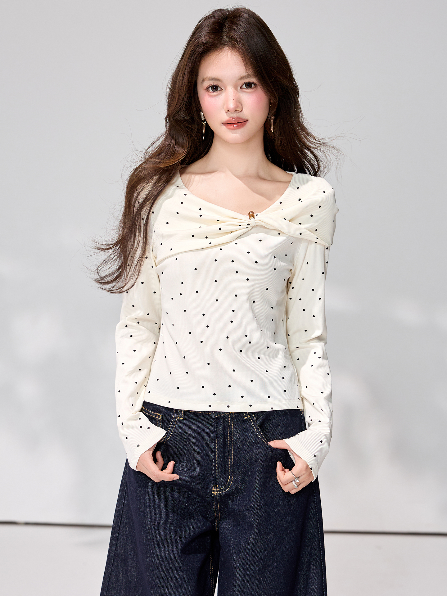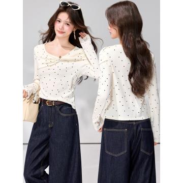 FA55847# 春季新款温柔杏色波点设计感修身长袖T恤百搭通勤上衣 服裝批發女裝批發服飾貨源