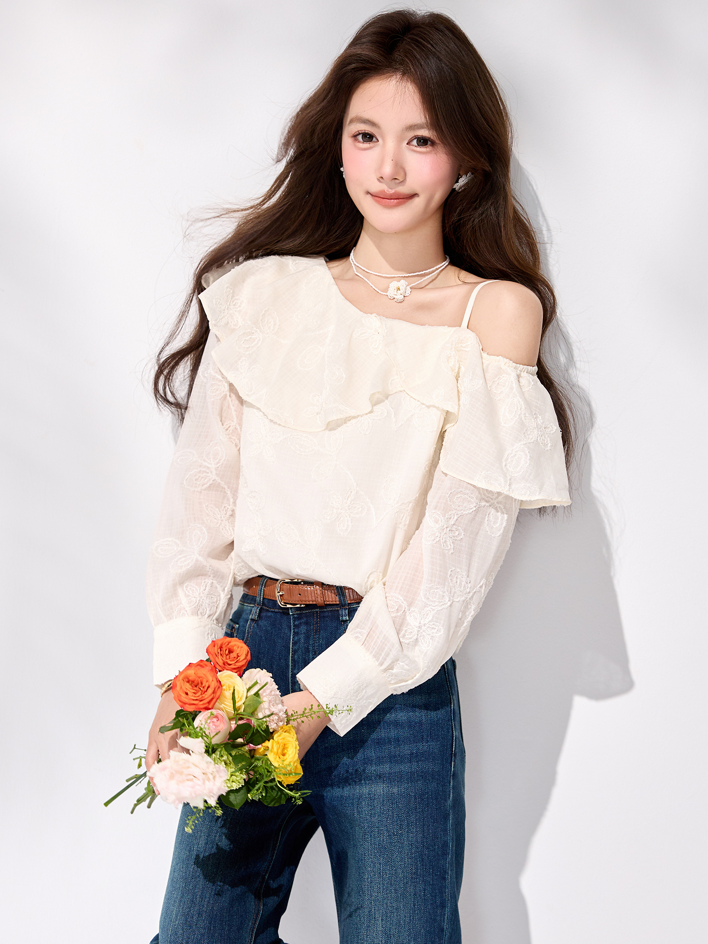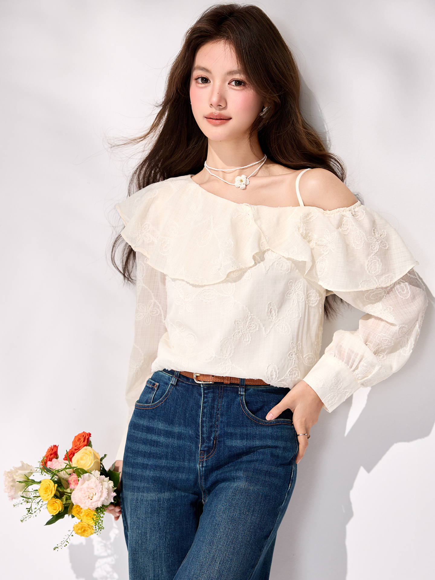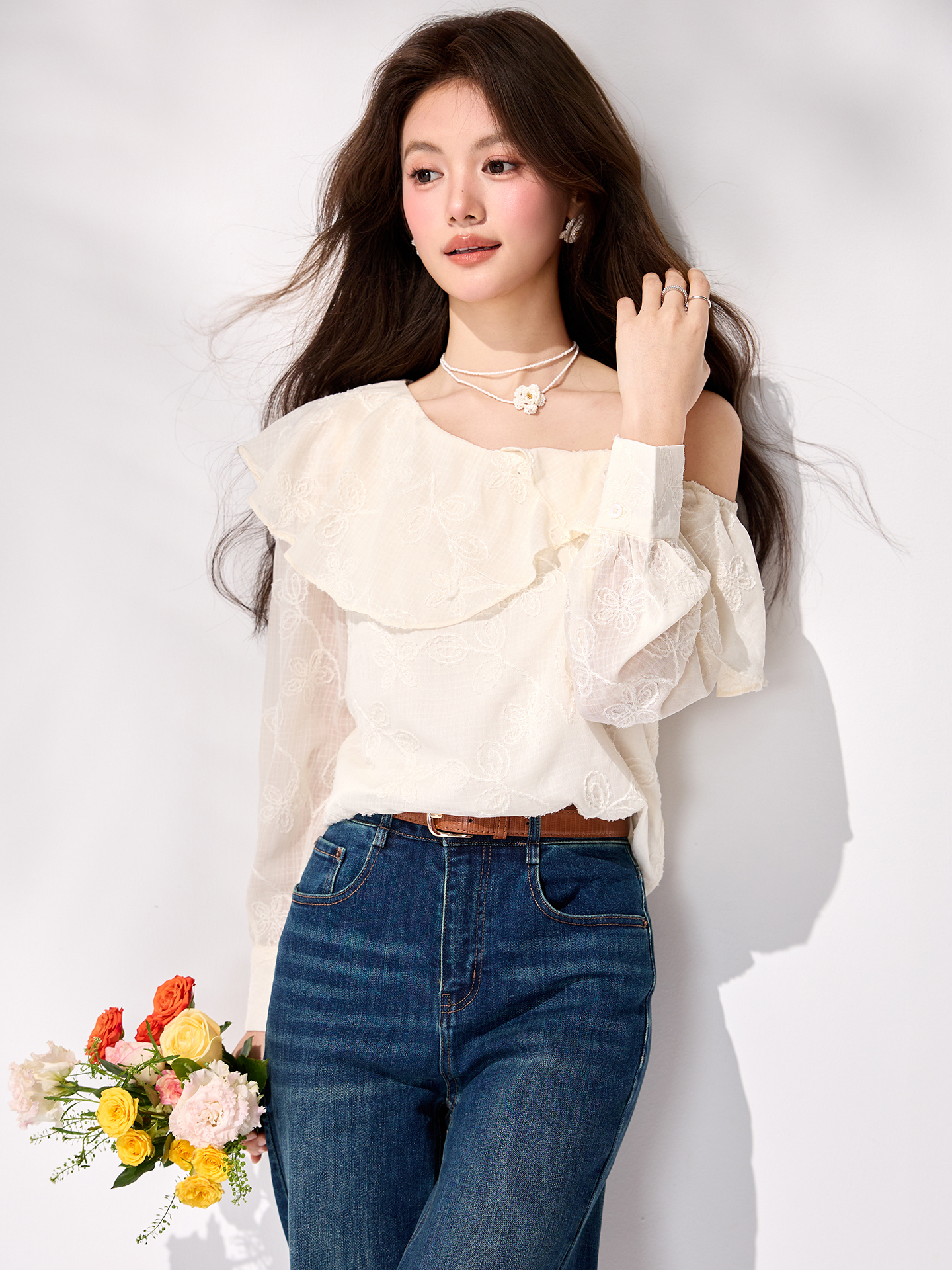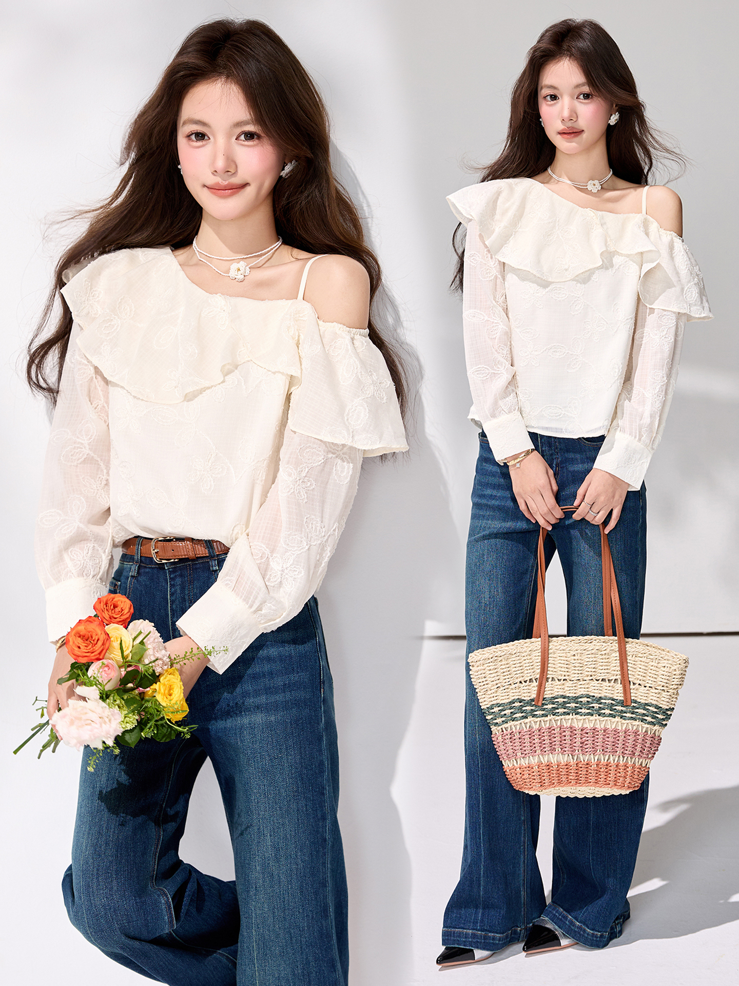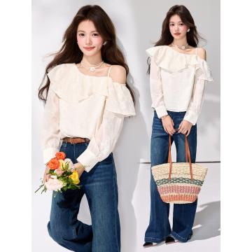 FA55849# 春季新款法式荷叶边露肩衬衫通勤气质温柔刺绣雪纺上衣 服裝批發女裝批發服飾貨源