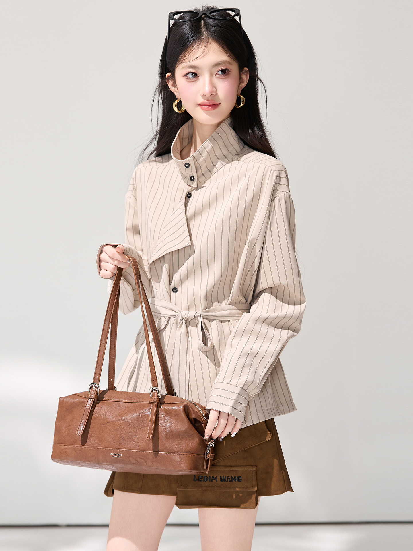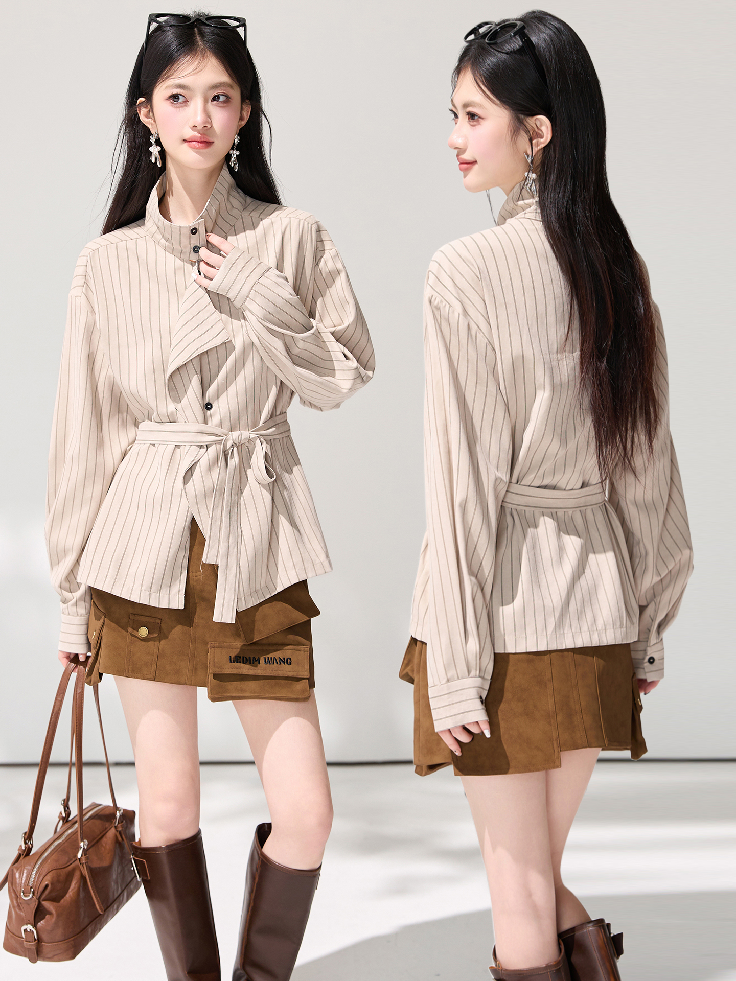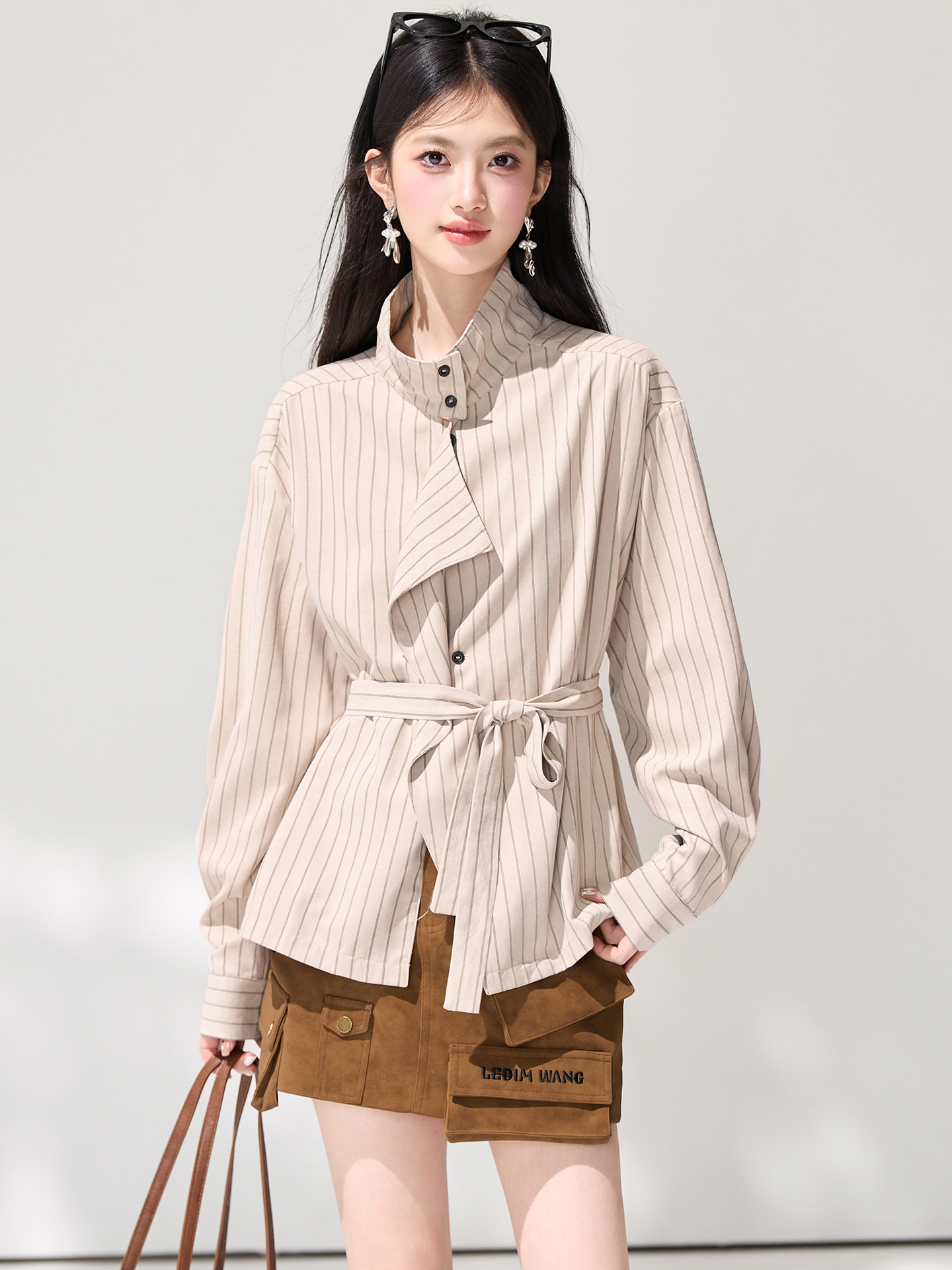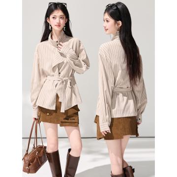 FA55853# 春季新款通勤百搭宽松高智感条纹系带老钱风衬衫上衣 服裝批發女裝批發服飾貨源