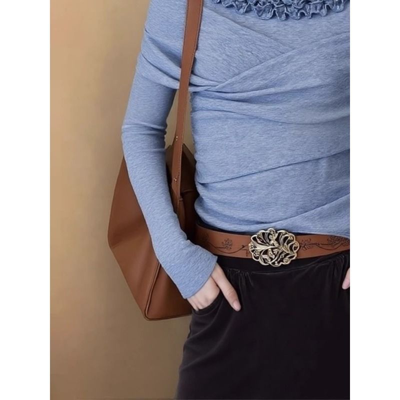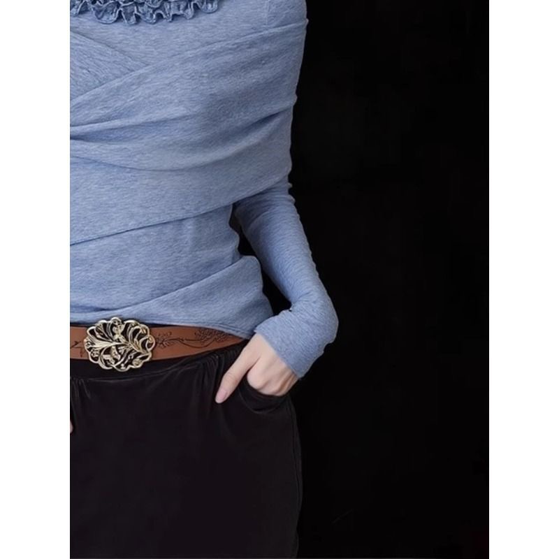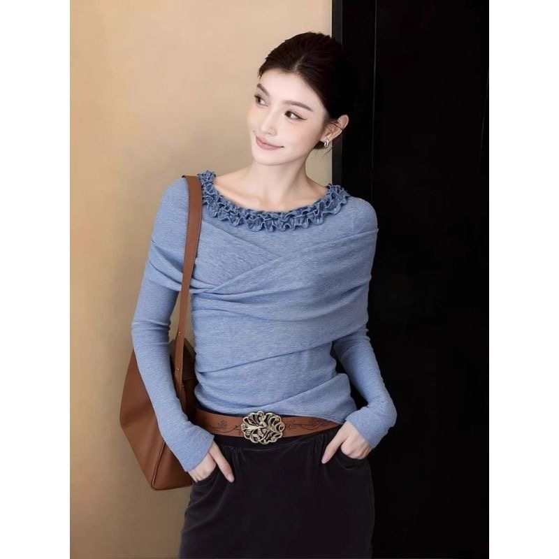 FA55858# 法式温柔风蓝色花边领打底衫女内搭秋冬款显瘦甜辣妹长袖小众上衣 服裝批發女裝批發服飾貨源