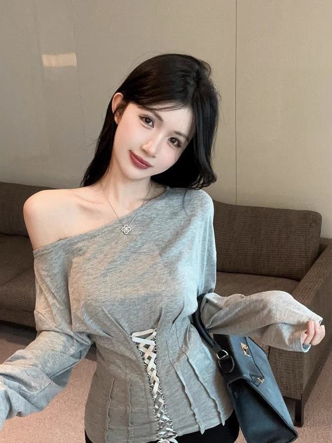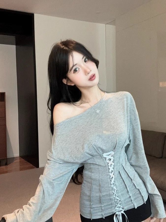 FA55859# 纯欲辣妹性感小众绑带鱼骨束腰上衣女设计独特斜领露肩长袖T恤ins 服裝批發女裝批發服飾貨源