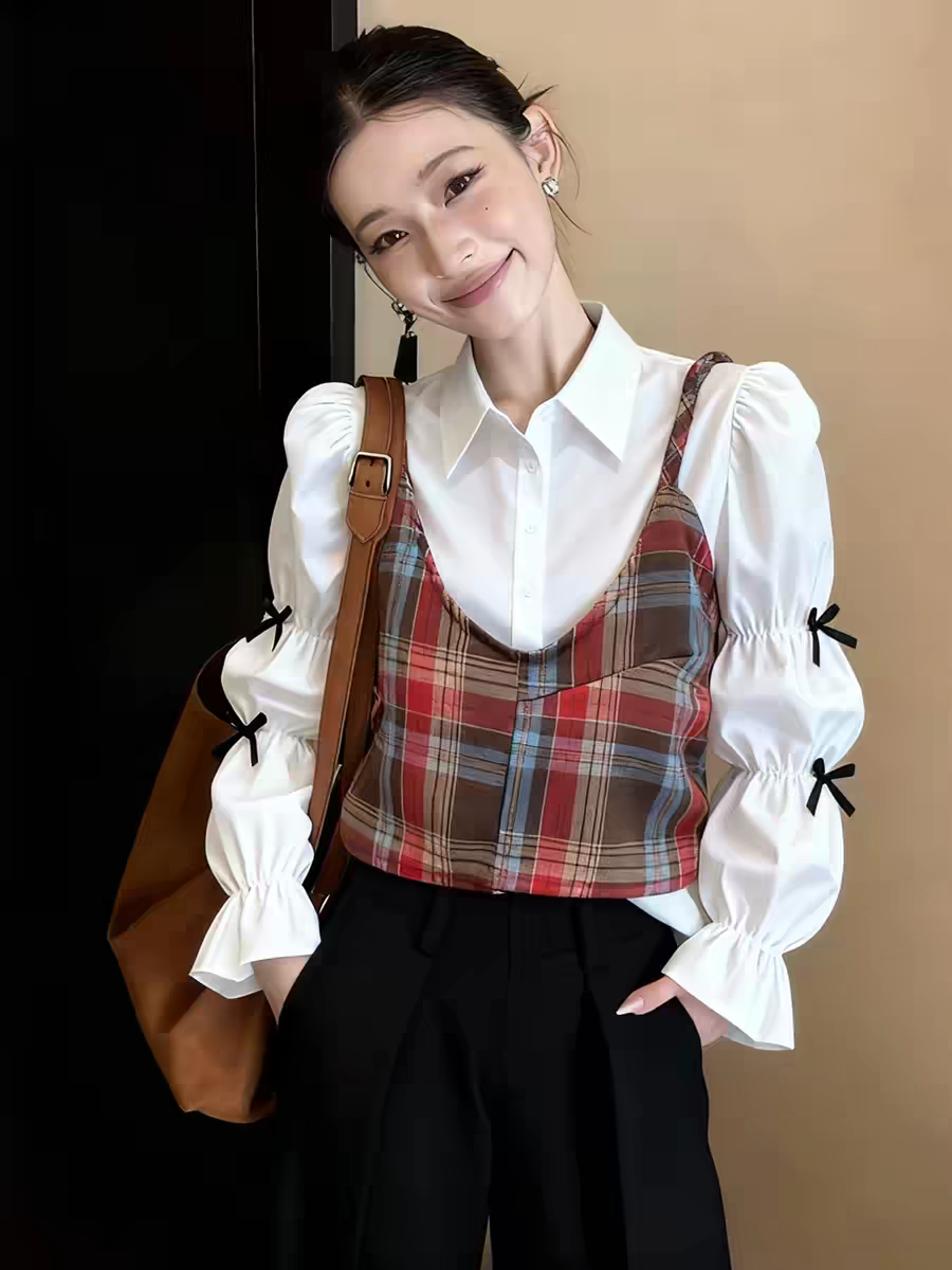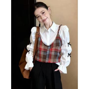 FA55864# 韩系高级感复古温柔风白色长袖女春季新款格纹吊带两件套女 服裝批發女裝批發服飾貨源