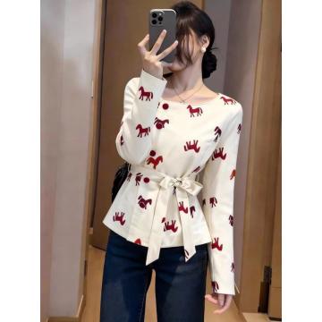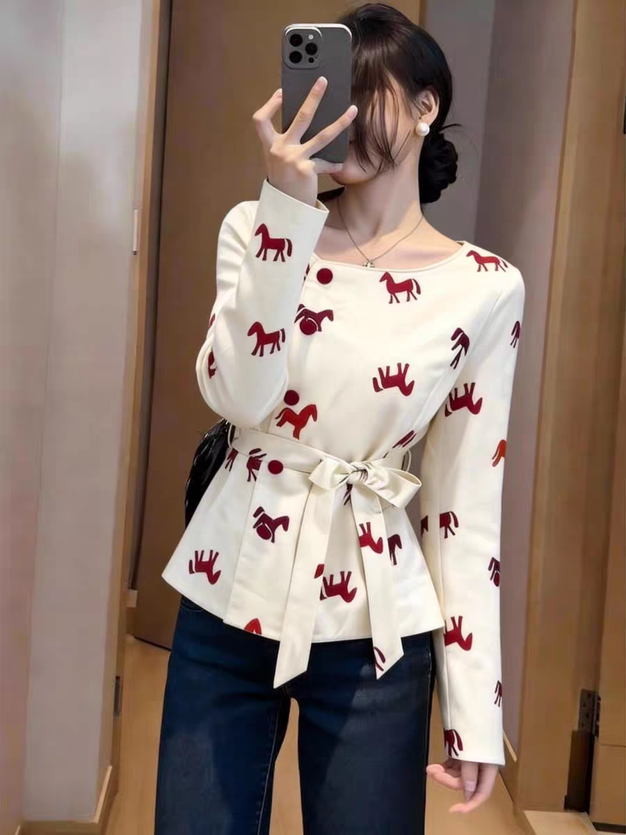 FA55866# 简约潮流时尚百搭日常通勤风白色上衣女早春收腰小马印花小衫 服裝批發女裝批發服飾貨源