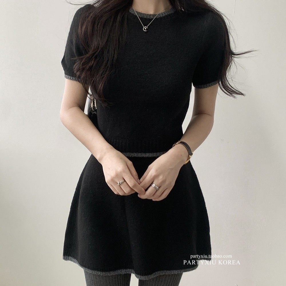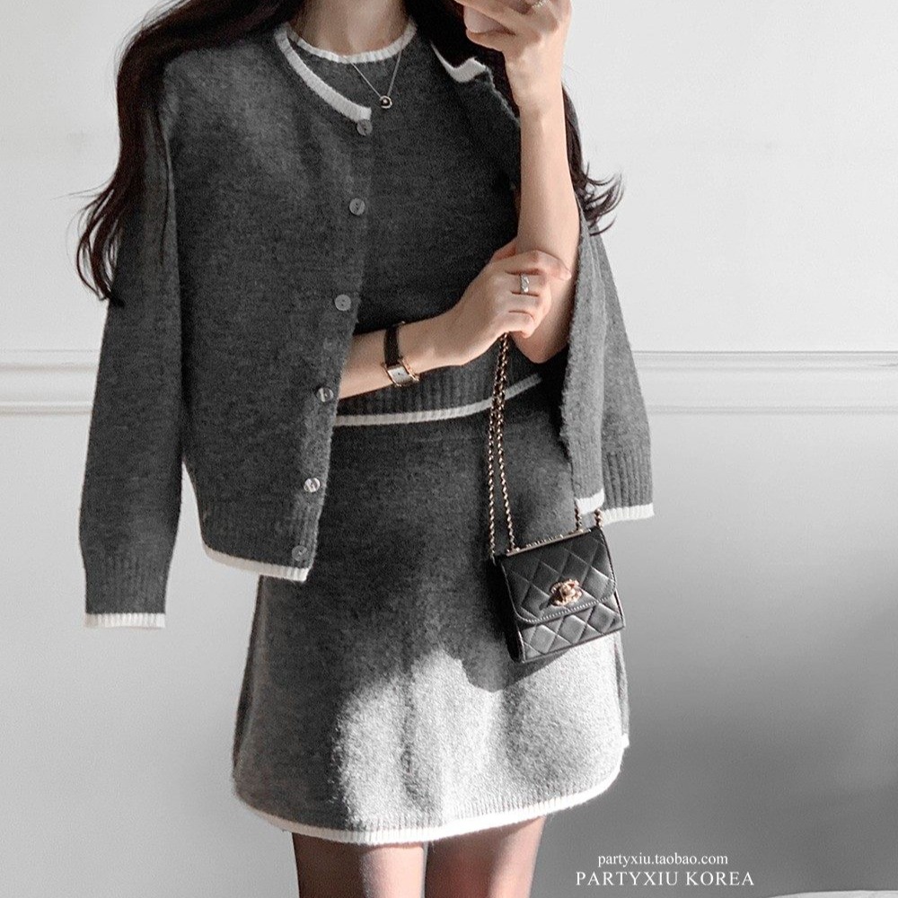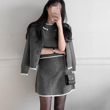 FA55883# 春新款针织套装女开衫套头短袖毛衣半身裙时尚慵懒风三件套 服裝批發女裝批發服飾貨源
