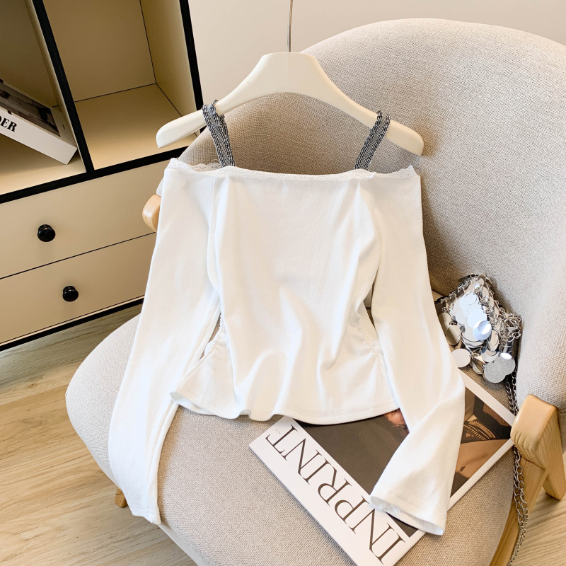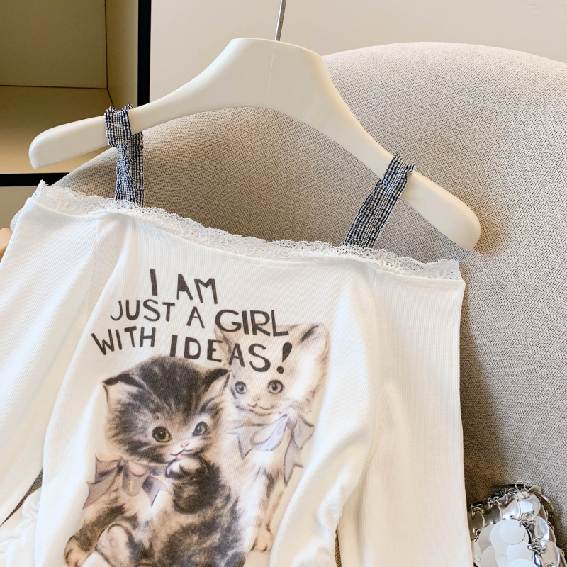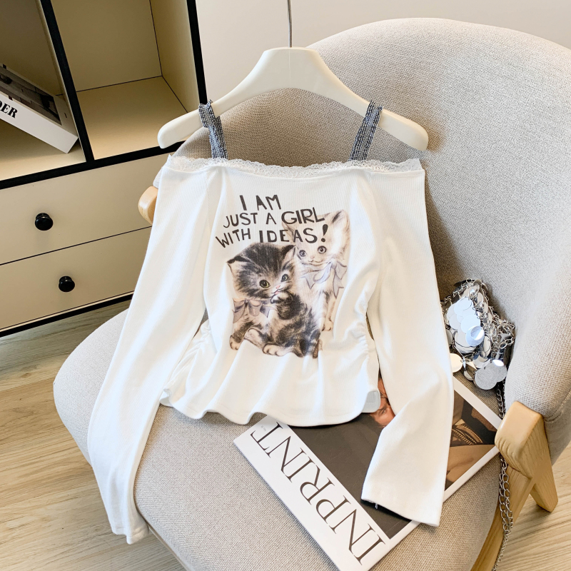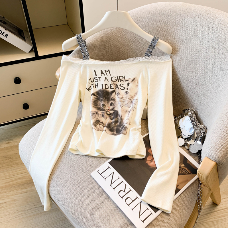 FA56022# 小猫印花一字肩洋气纯欲风长袖T恤女上衣修身短款辣妹 服裝批發女裝批發服飾貨源