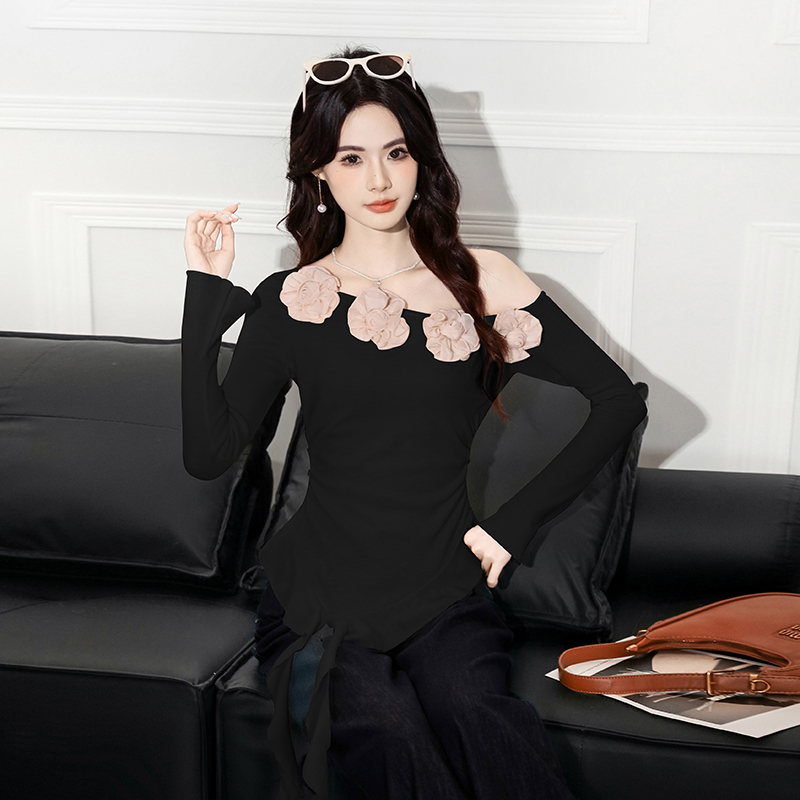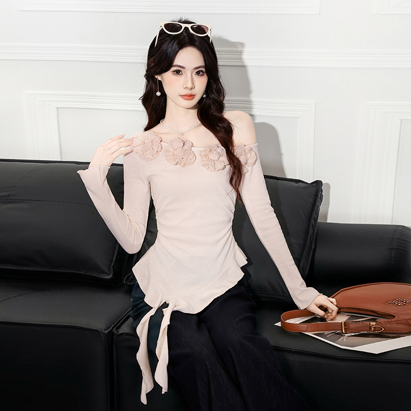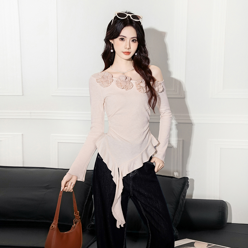 FA56026# 早春新款韩系花朵氛围感露肩不规则荷叶边长袖百搭上衣 服裝批發女裝批發服飾貨源