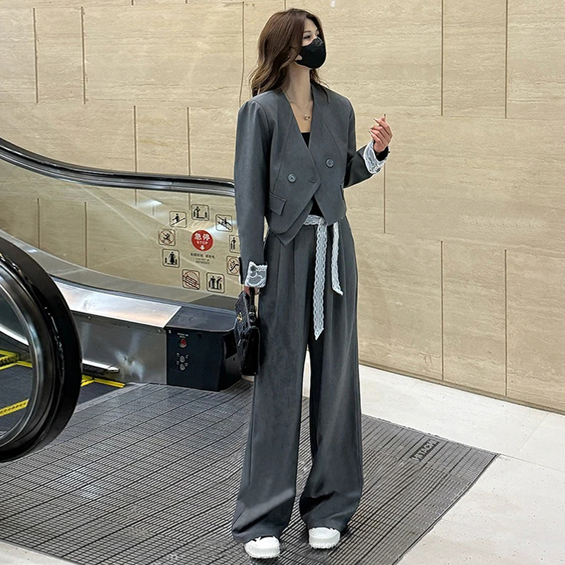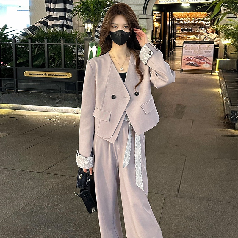 FA56063# 欧货气质两件套装春秋时尚蕾丝拼接翻袖西装外套+阔腿裤 服裝批發女裝批發服飾貨源