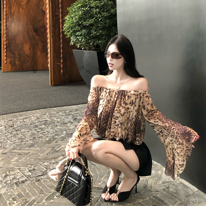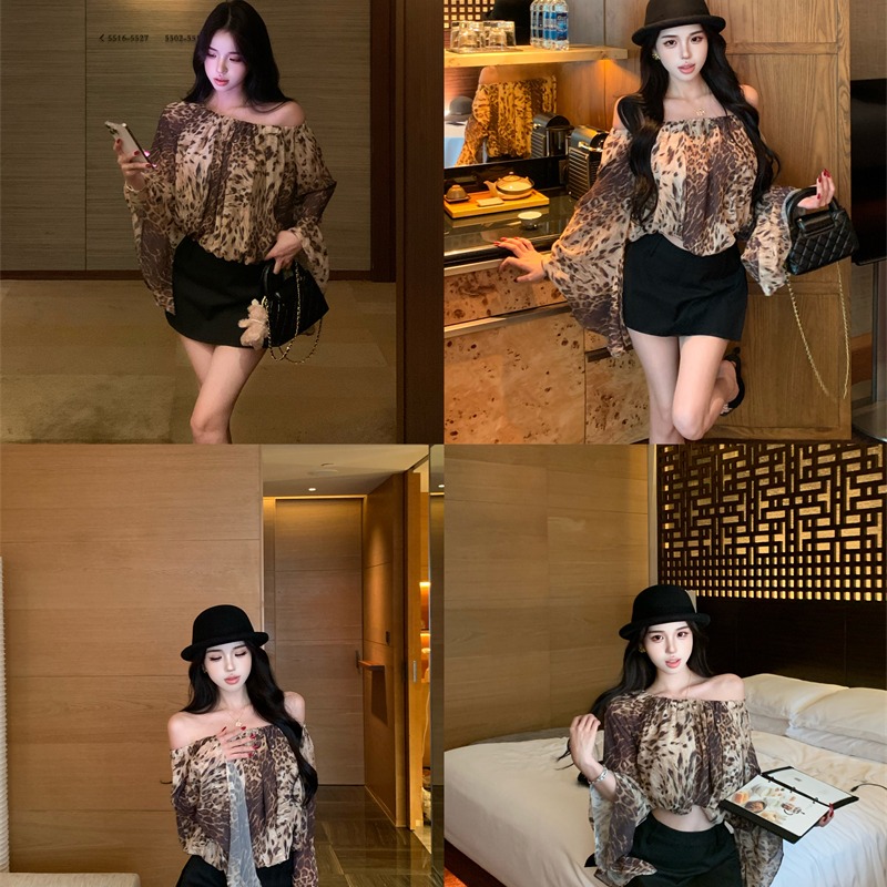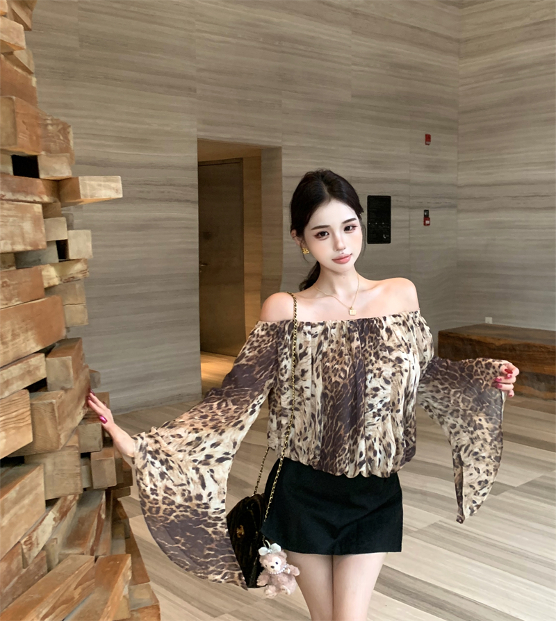 FA56130# 性感小野猫一字斜肩露肩豹纹喇叭袖衬衫短款长袖上衣 服裝批發女裝批發服飾貨源