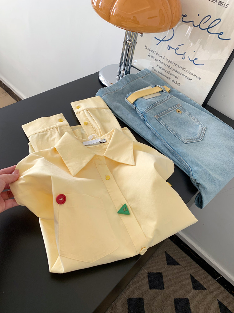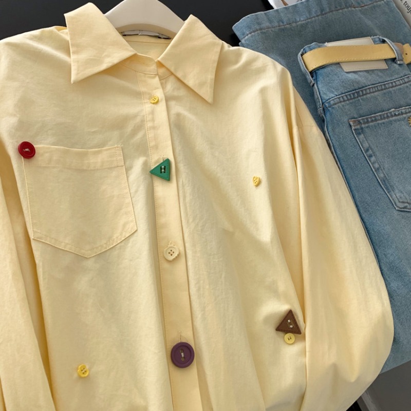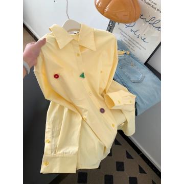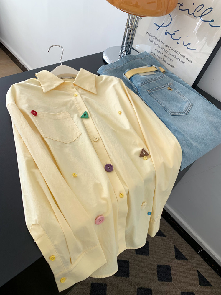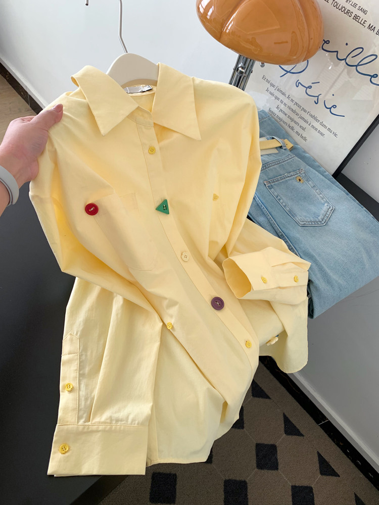 FA56234# 黄色宽松设计感翻领长袖衬衫女上衣小个子超火减龄衬衣 服裝批發女裝批發服飾貨源