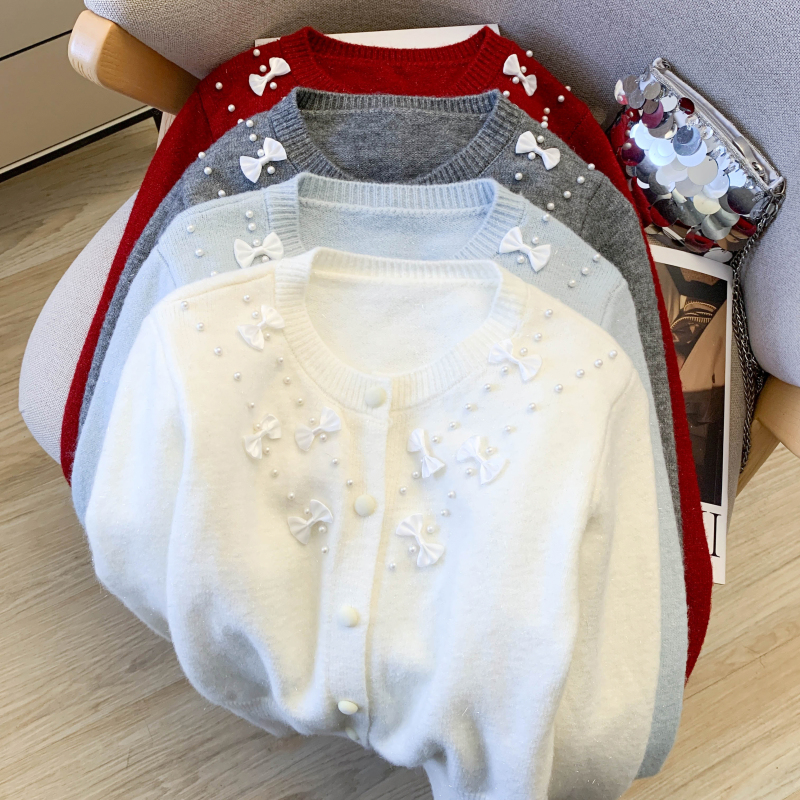FA56392# 春款重工钉珠蝴蝶结毛衣韩系慵懒风女高级感针织开衫外套上衣 服裝批發女裝批發服飾貨源