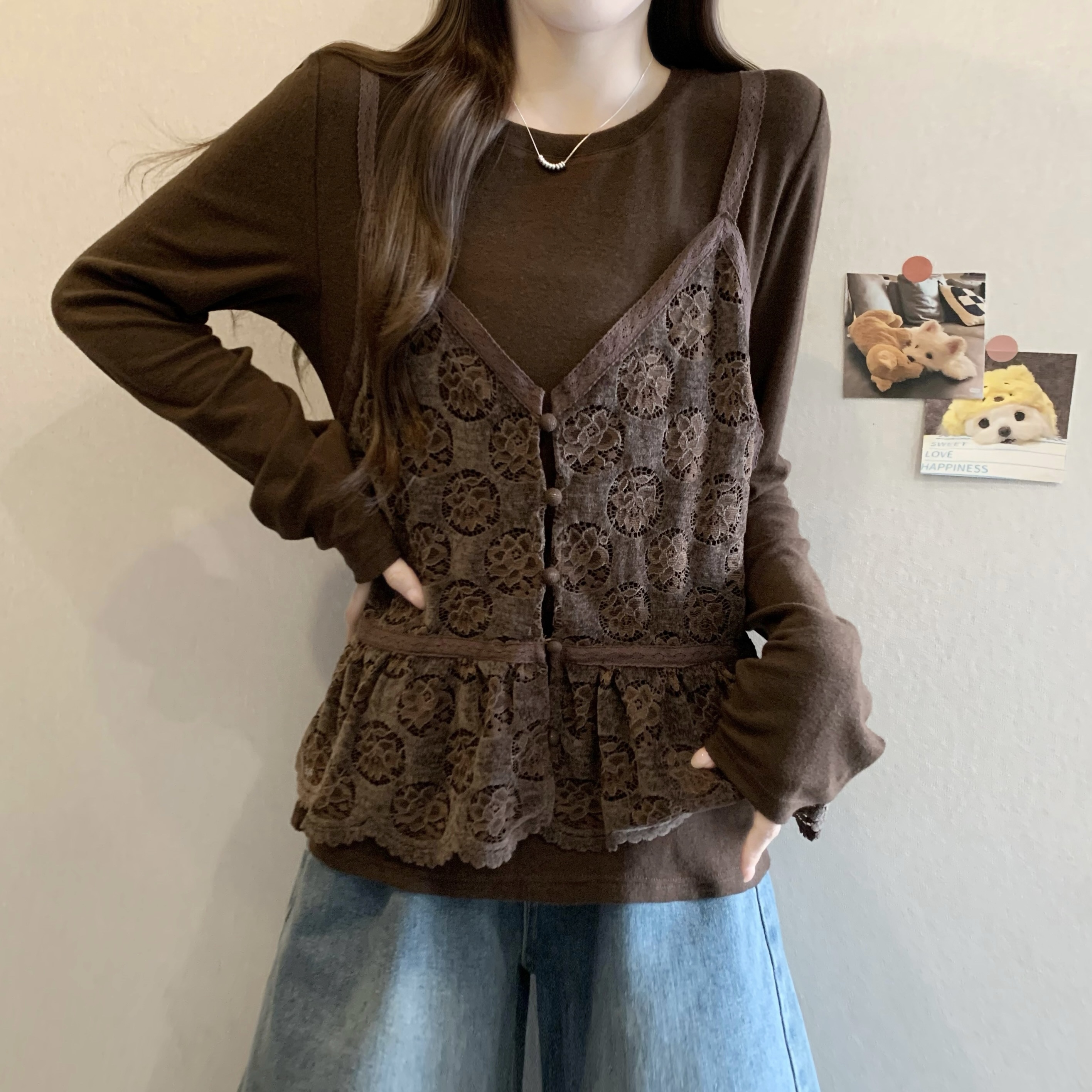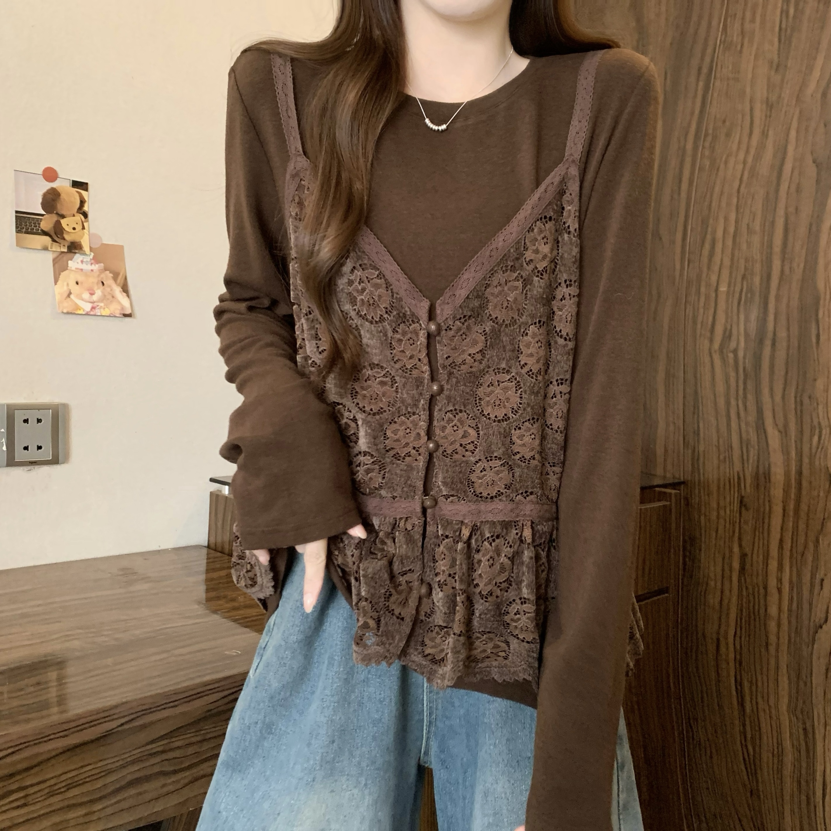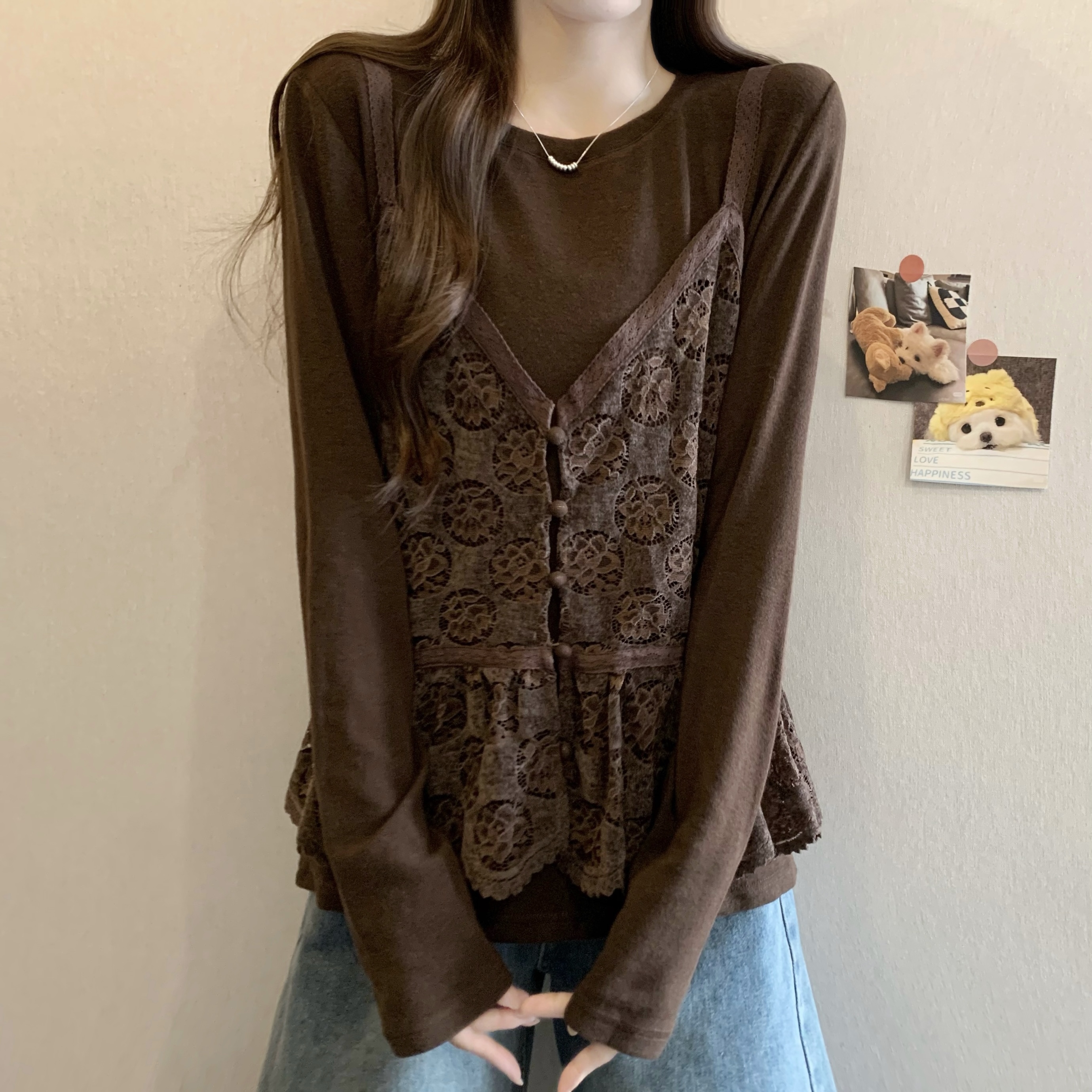 FA56451# 胖MM秋冬新款时尚百搭宽松显瘦弹力针织拼接蕾丝长袖假两件上衣女 服裝批發女裝批發服飾貨源
